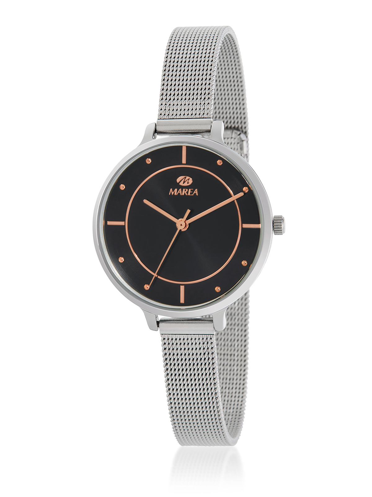 Movimiento japonés: 3 agujas Diámetro Caja: 32 mm. Material Caja: Metal. Material Brazalete: Acero. Esfera: Color blanca con índices y agujas en color rose gold. Resistente al agua: 3 ATM