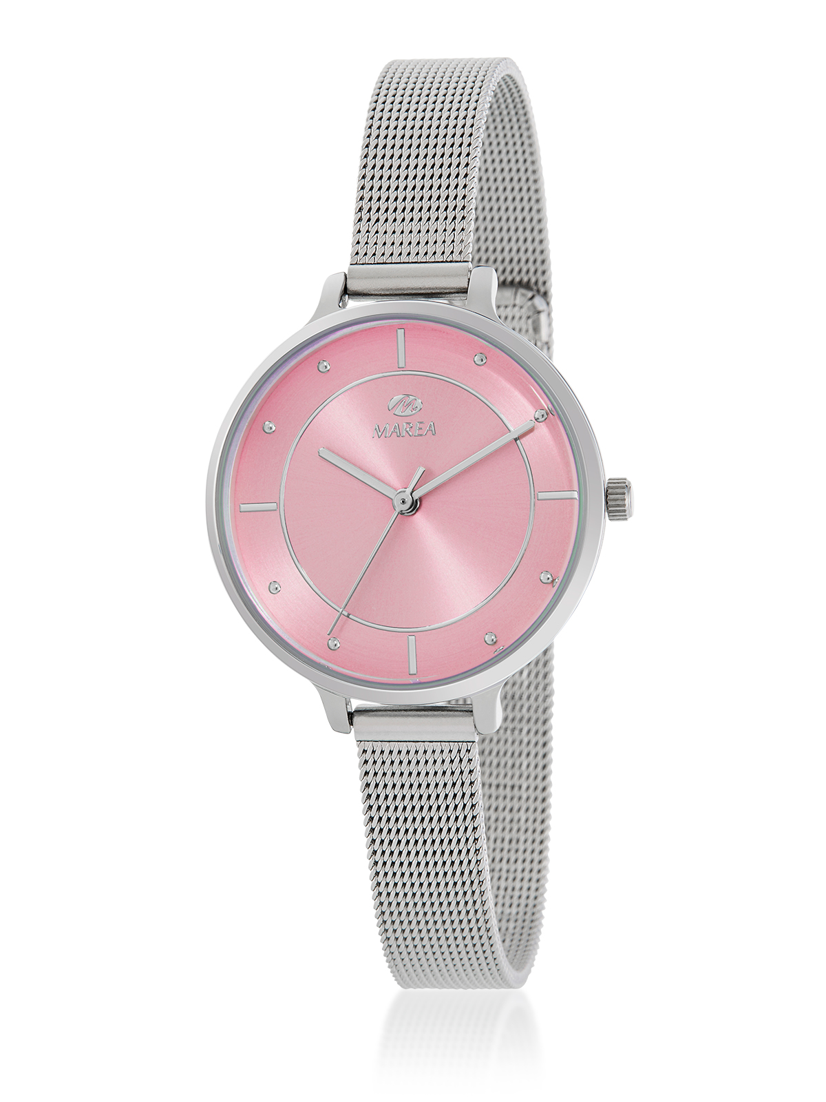 Movimiento japonés: 3 agujas Diámetro Caja: 32 mm. Material Caja: Metal. Material Brazalete: Acero. Esfera: Color rosa. Resistente al agua: 3 ATM