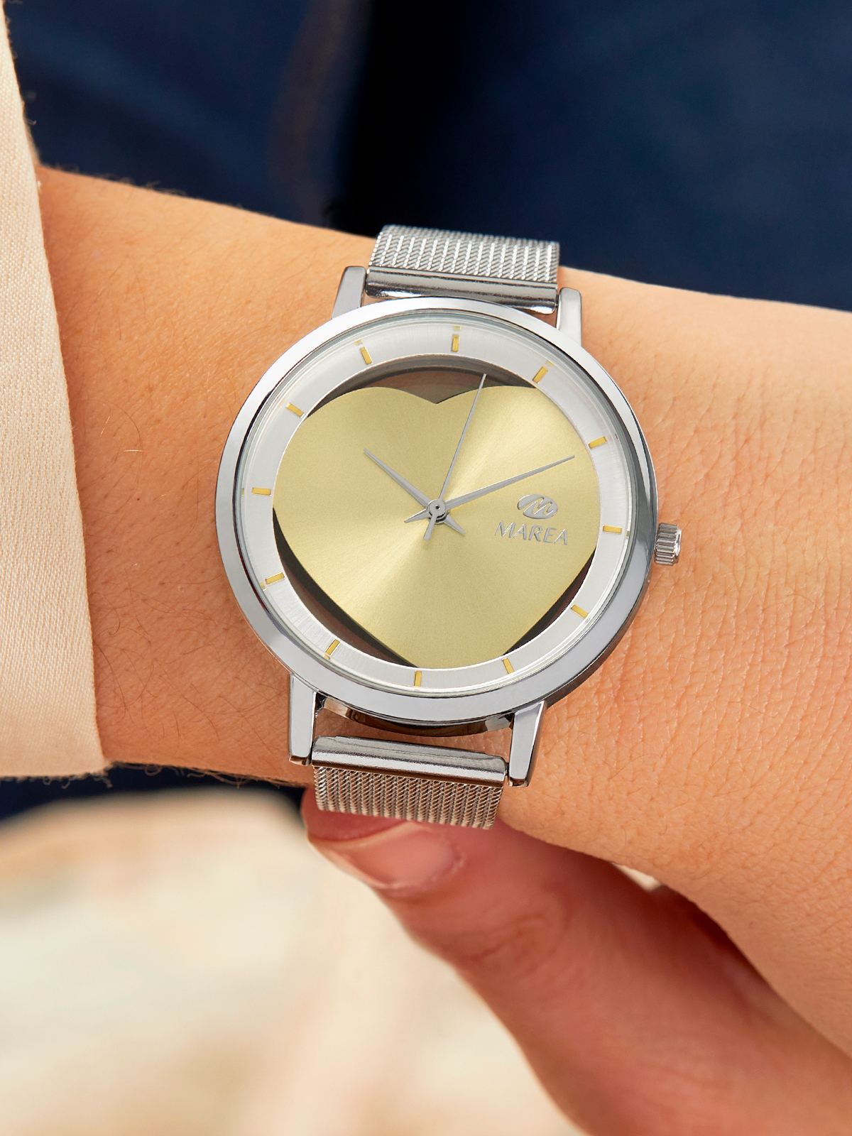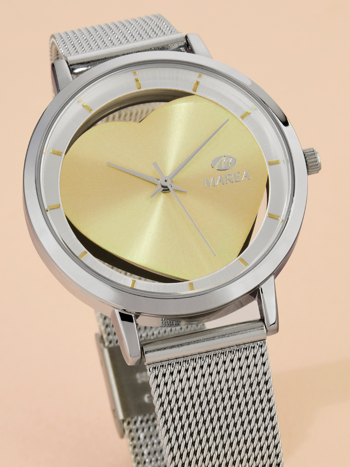 Movimiento japonés: 3 agujas Diámetro Caja: 36 mm. Material Caja: Metal. Material Brazalete: Acero. Esfera: Transparente con motivo de corazón color champagne. Resistente al agua: 3 ATM