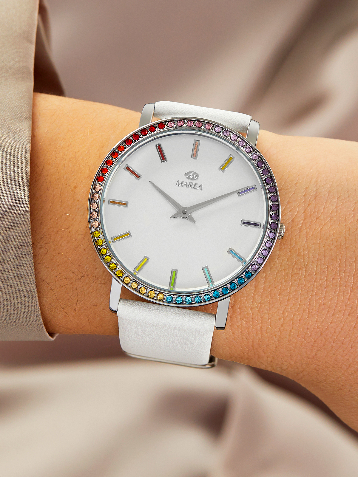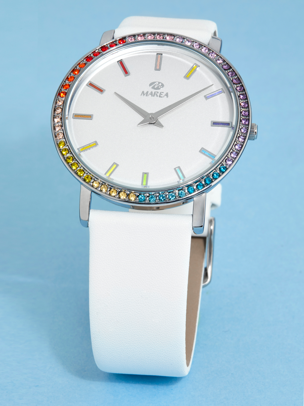 Movimiento japonés: 2 agujas. Diámetro Caja: 40 mm. Material Caja: Metal con pedrería arcos iris en bisel. Material Brazalete: Piel color blanco. Esfera: Color blanco con índices arco iris. Resistente al agua: 3 ATM.