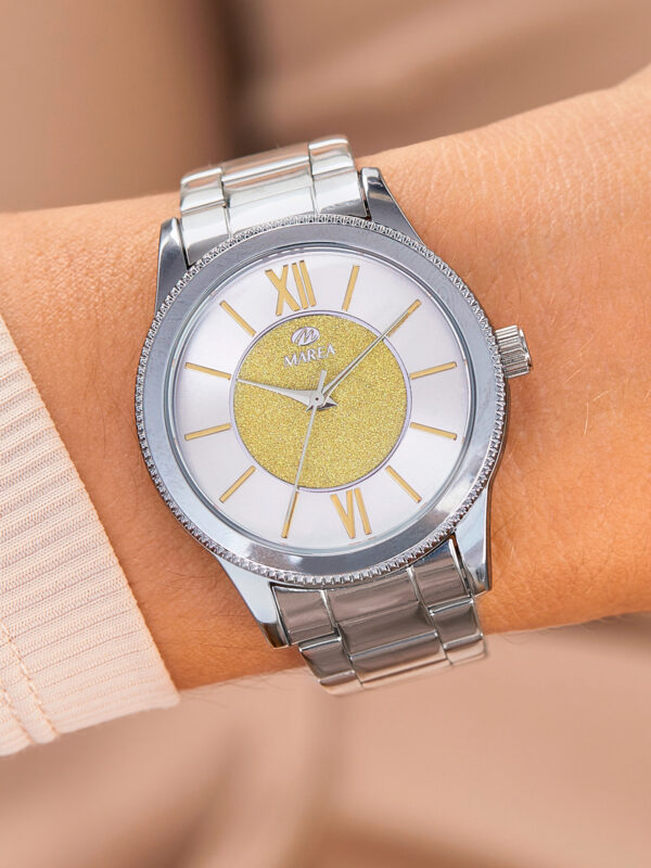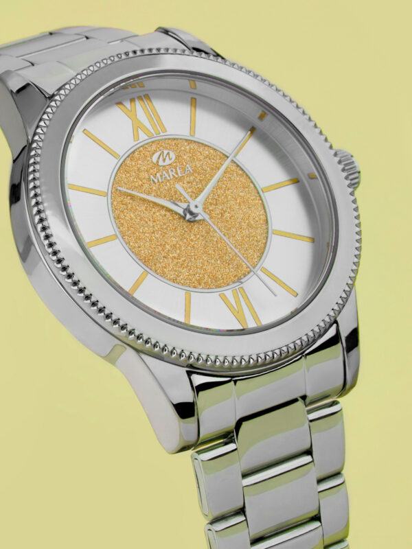Movimiento japonés: 3 agujas. Diámetro Caja: 36 mm. Material Caja: Metal. Material Brazalete: Acero. Esfera: Color plateado con índices y parte central de purpurina en color dorado. Resistente al agua: 5 ATM.