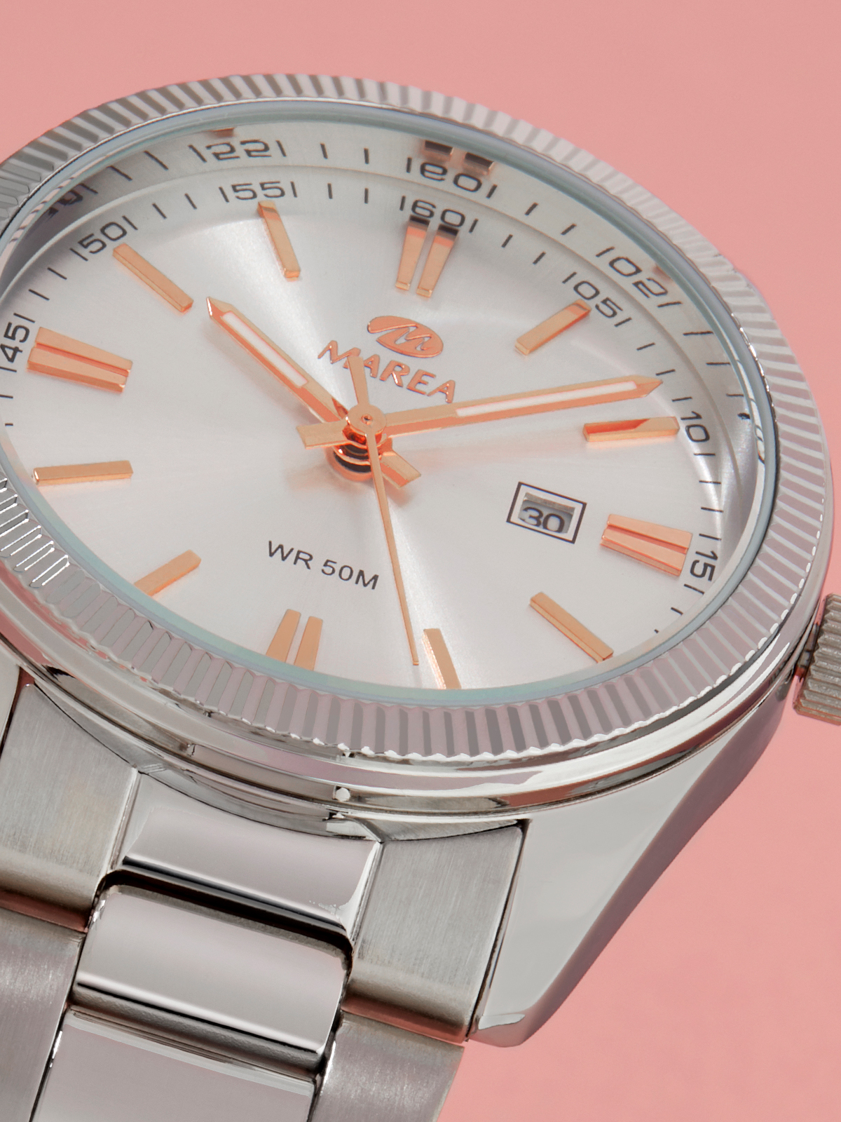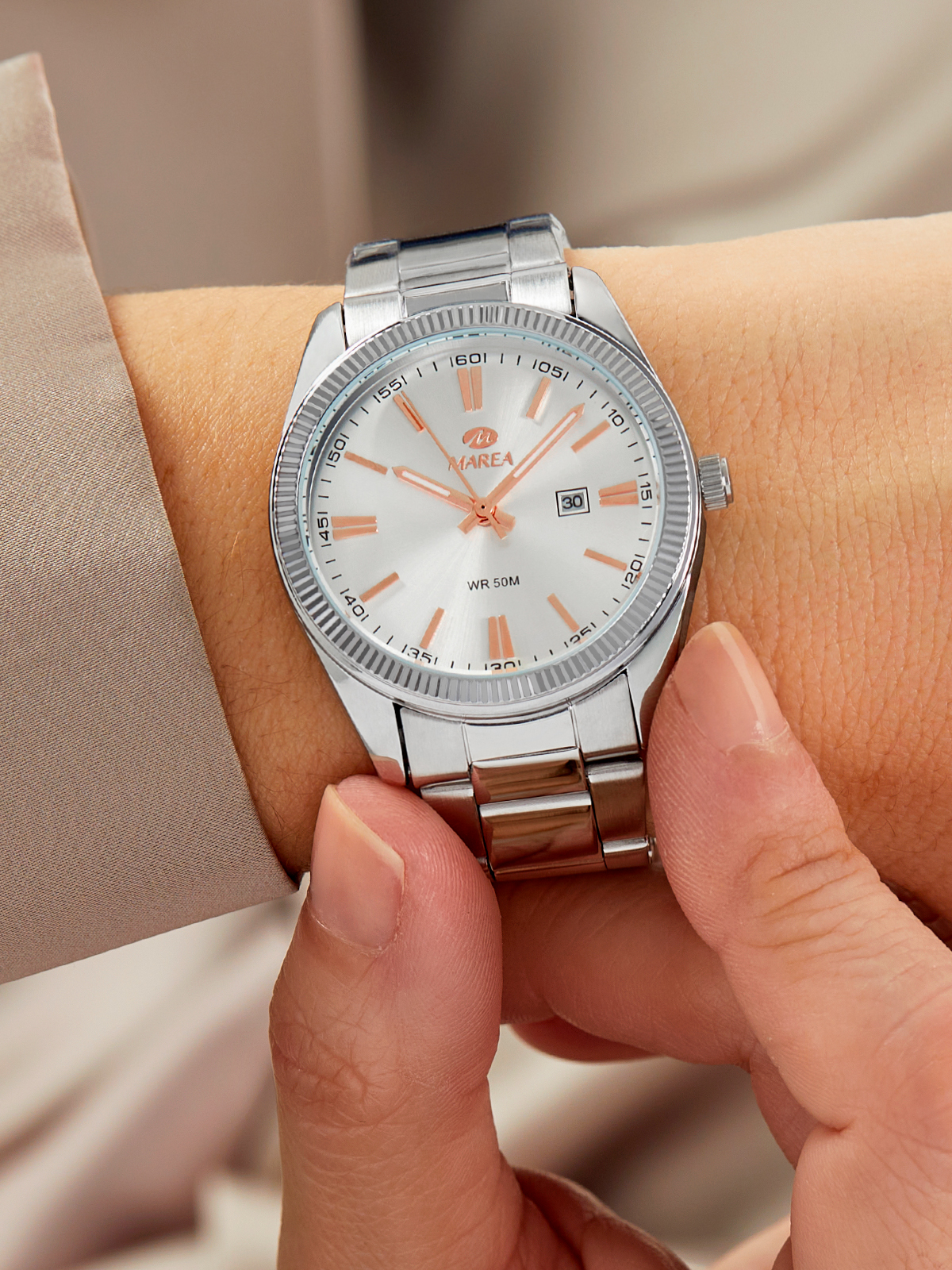 Movimiento japonés: 3 agujas con calendario. Diámetro Caja: 34 mm. Material Caja: Metal. Material Brazalete: Acero. Esfera: Color plateado con índices y agujas color rose gold. Resistente al agua: 5 ATM.