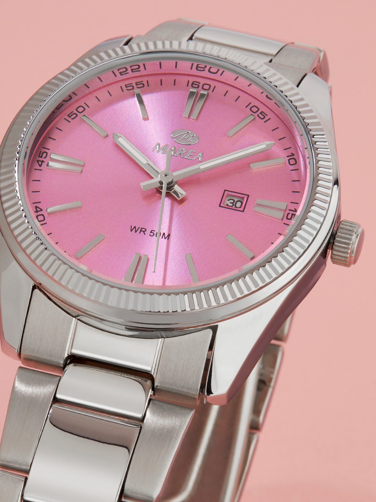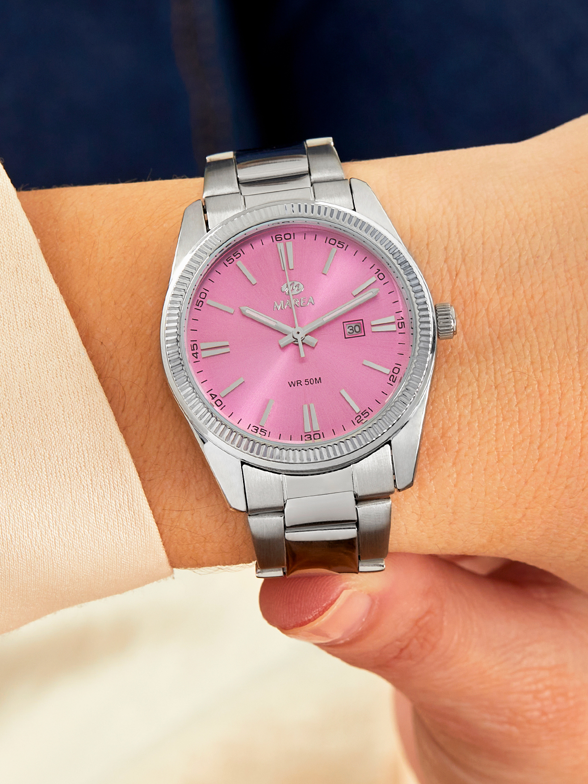 Movimiento japonés: 3 agujas con calendario. Diámetro Caja: 34 mm. Material Caja: Metal. Material Brazalete: Acero. Esfera: Color rosa. Resistente al agua: 5 ATM.