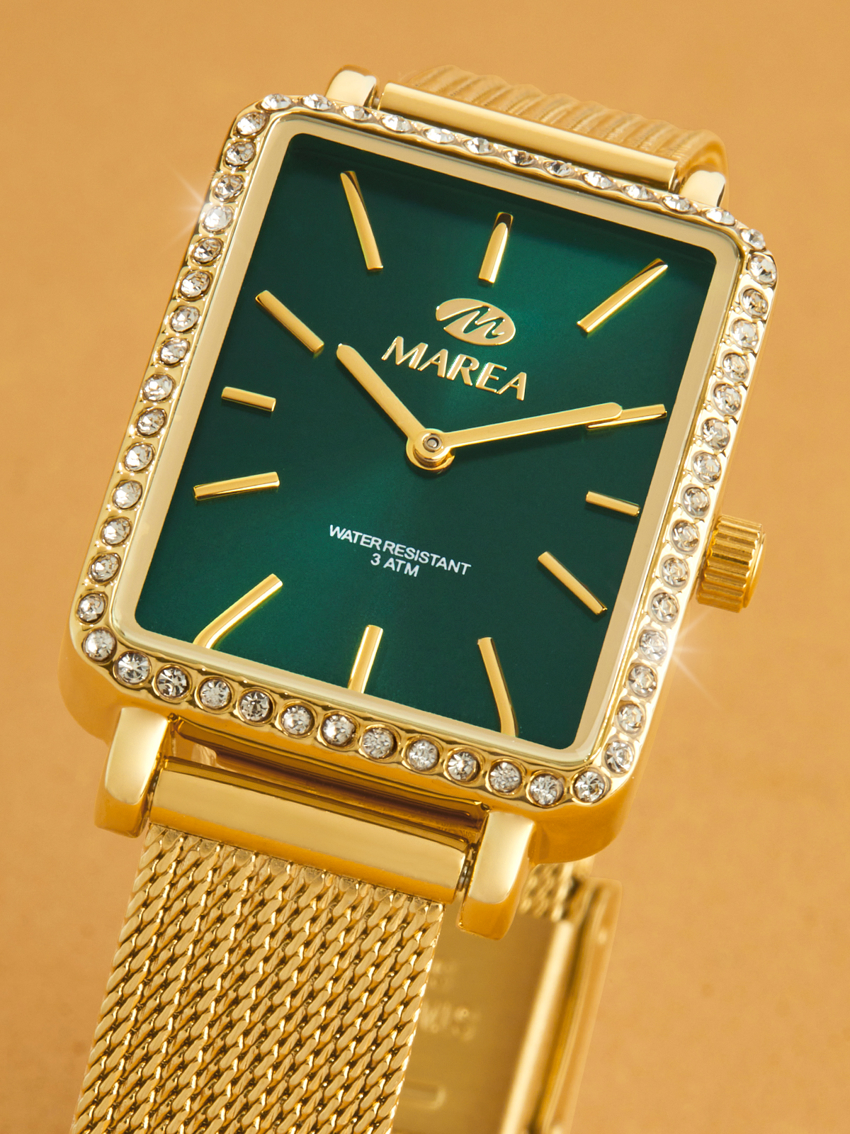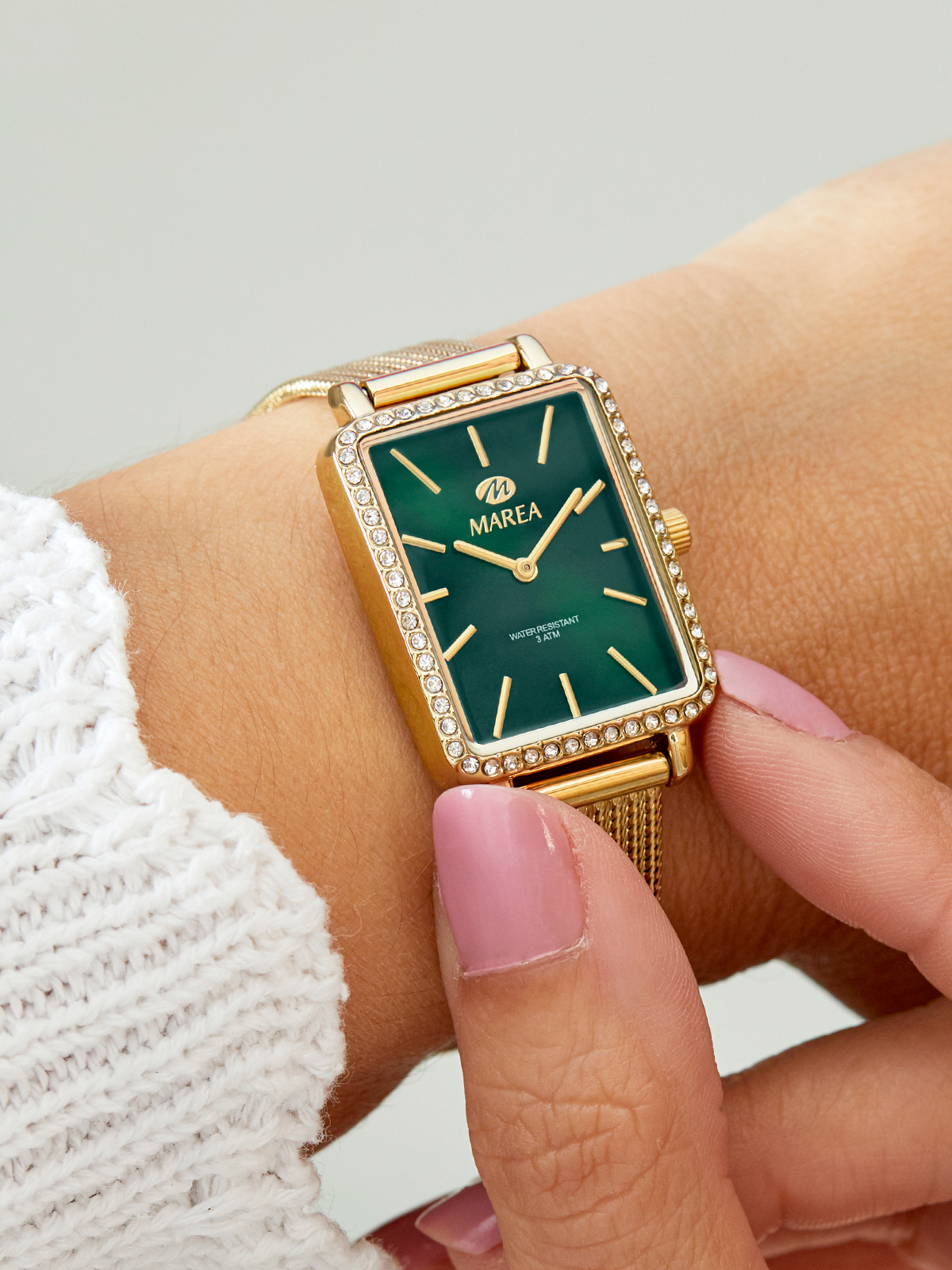 Movimiento japonés: 2 agujas. Medida Caja: 22 x 35 mm. Material Caja: Metal color dorado con pedrería en bisel. Material Brazalete: Acero color dorado. Esfera: Color verde con agujas e índices en color dorado. Resistente al agua: 3 ATM.