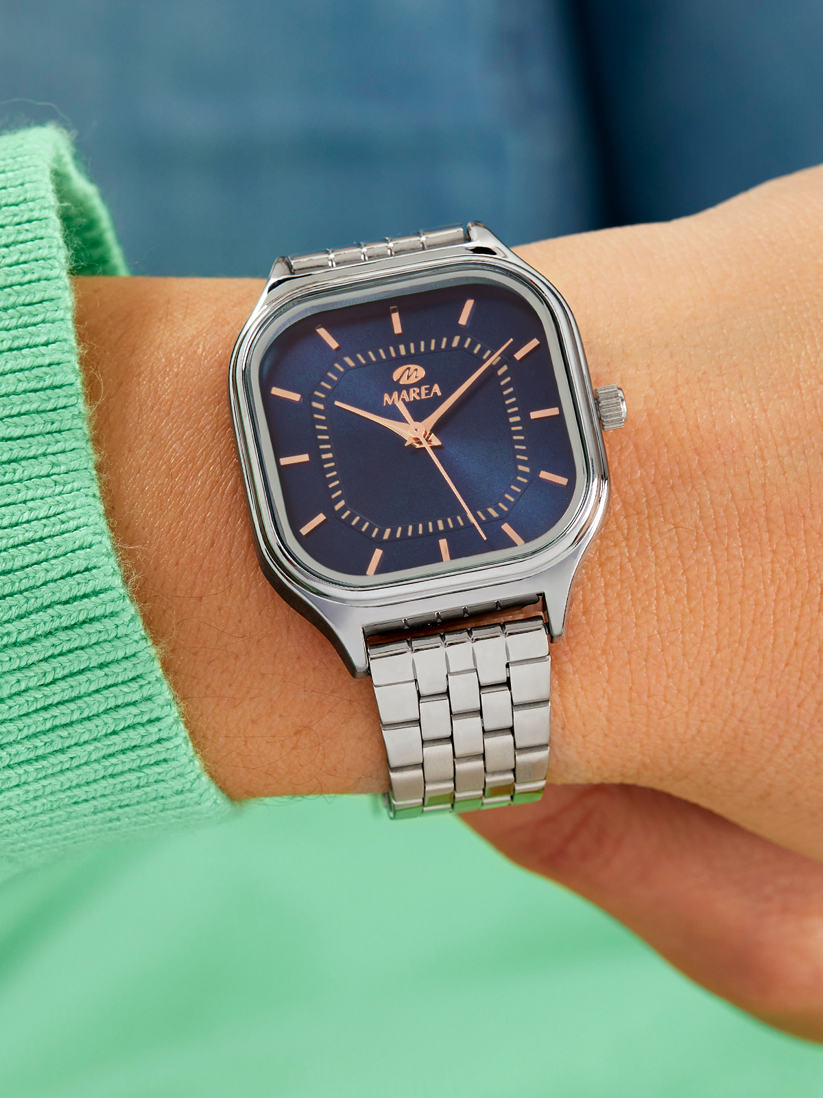 Movimiento japonés: 3 agujas. Diámetro Caja: 32 mm. Material Caja: Metal con tapa y corona de acero. Material Brazalete: Acero. Esfera: Color azul oscuro con índices y agujas en color rose gold. Resistente al agua: 3 ATM.