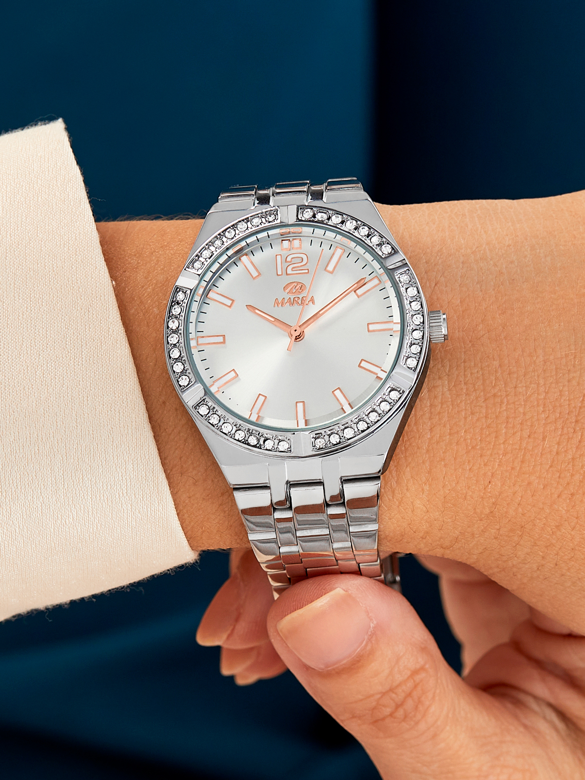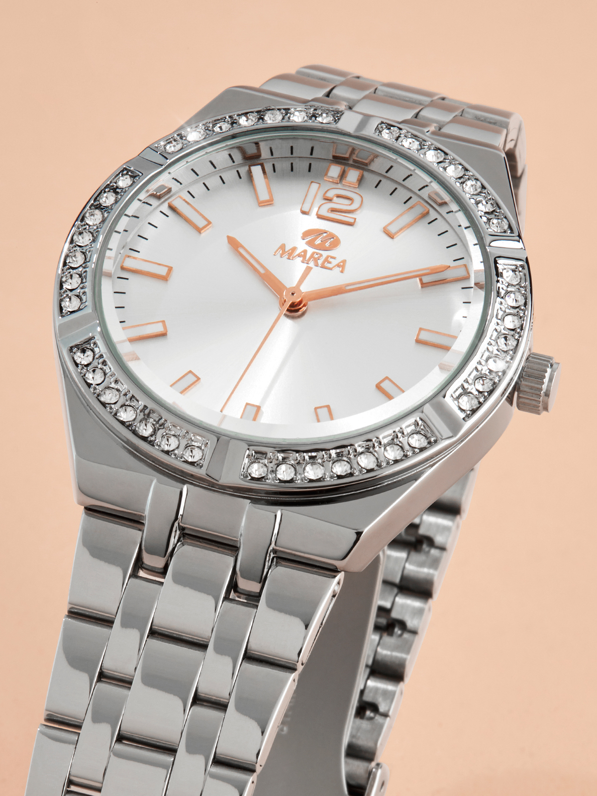 Esfera: Color plateado con índices y agujas color rose gold.