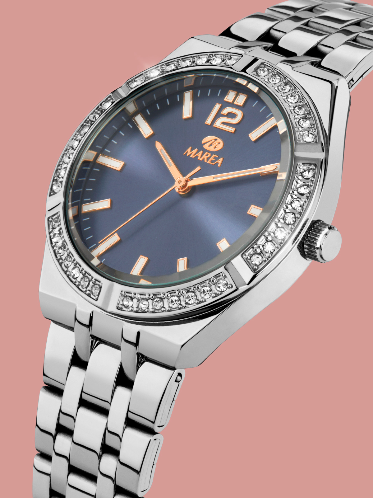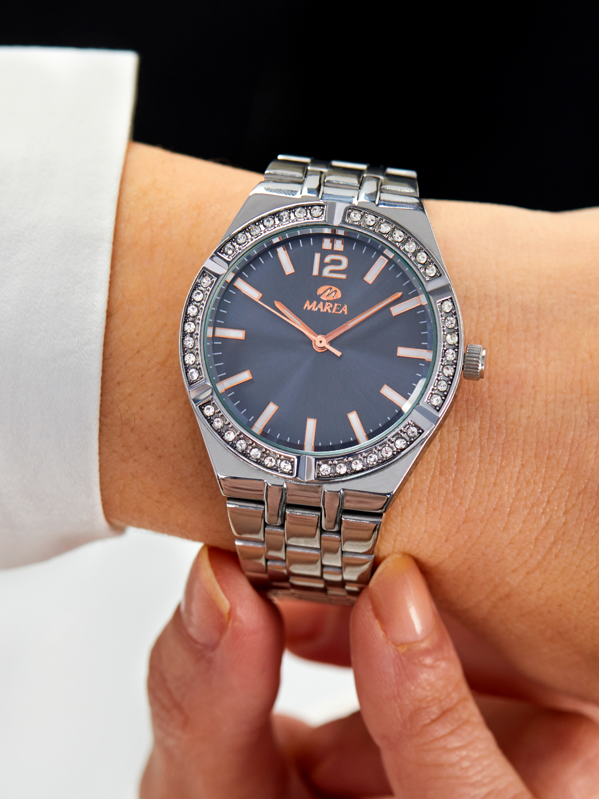 Esfera: Color azul oscuro con índices y agujas color rose gold.