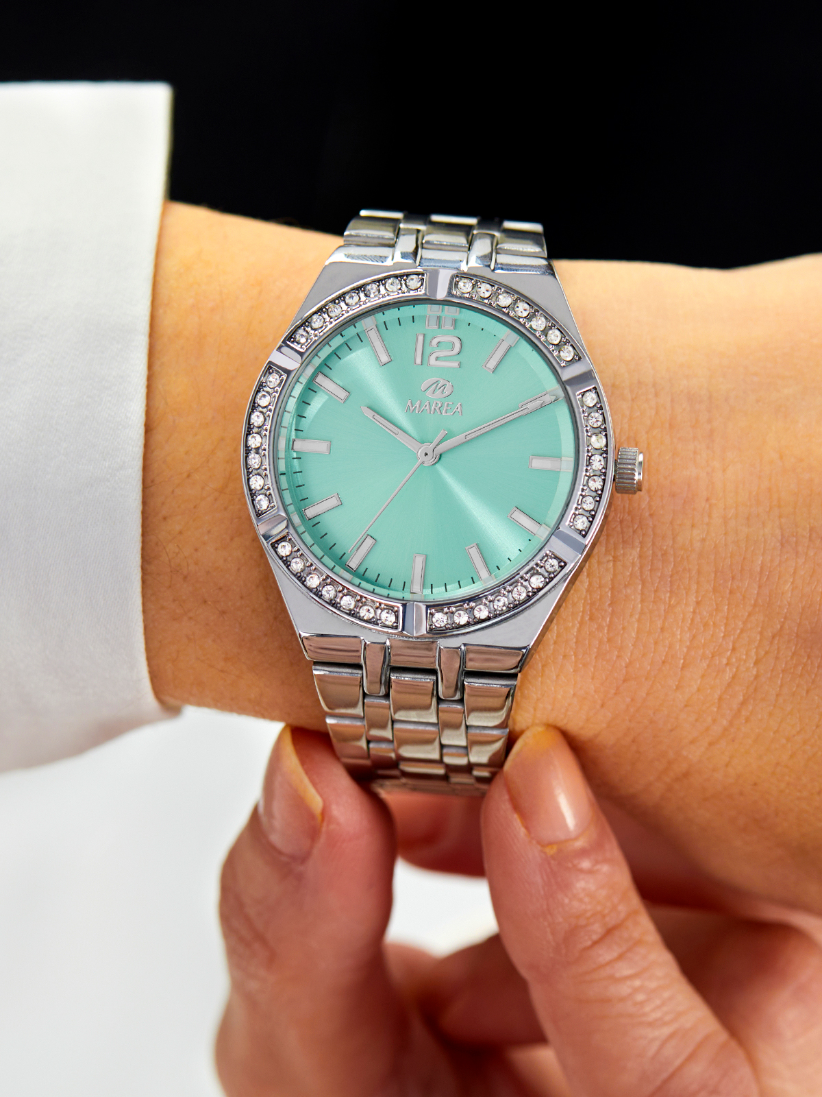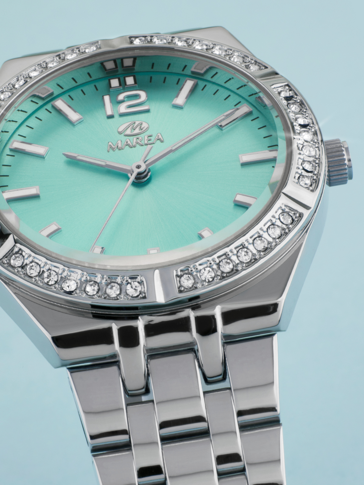Movimiento japonés: 3 agujas. Diámetro Caja: 36 mm. Material Caja: Metal con pedrería en bisel, con tapa trasera y corona de acero. Material Brazalete: Acero. Esfera: Color turquesa. Resistente al agua: 3 ATM.