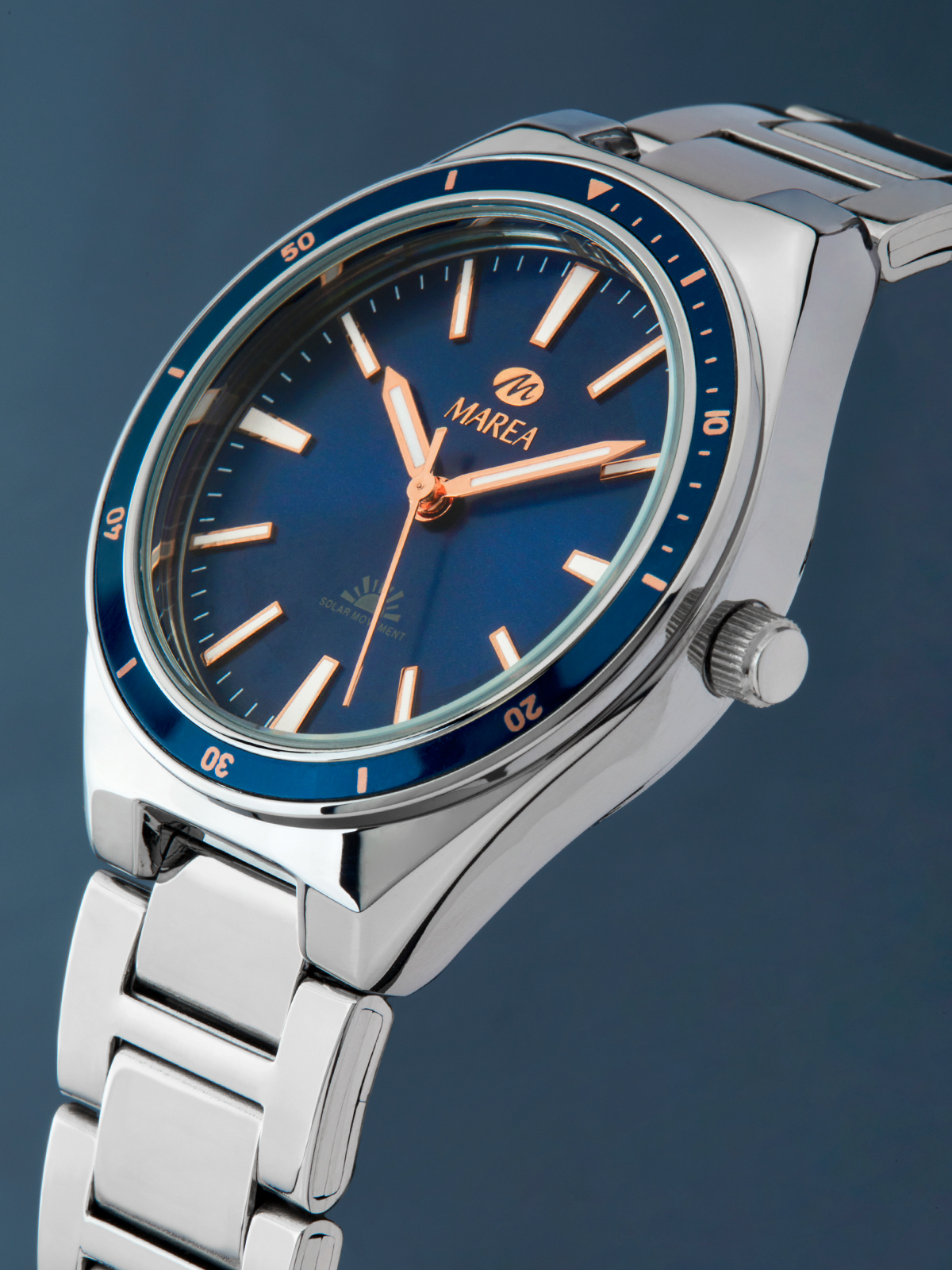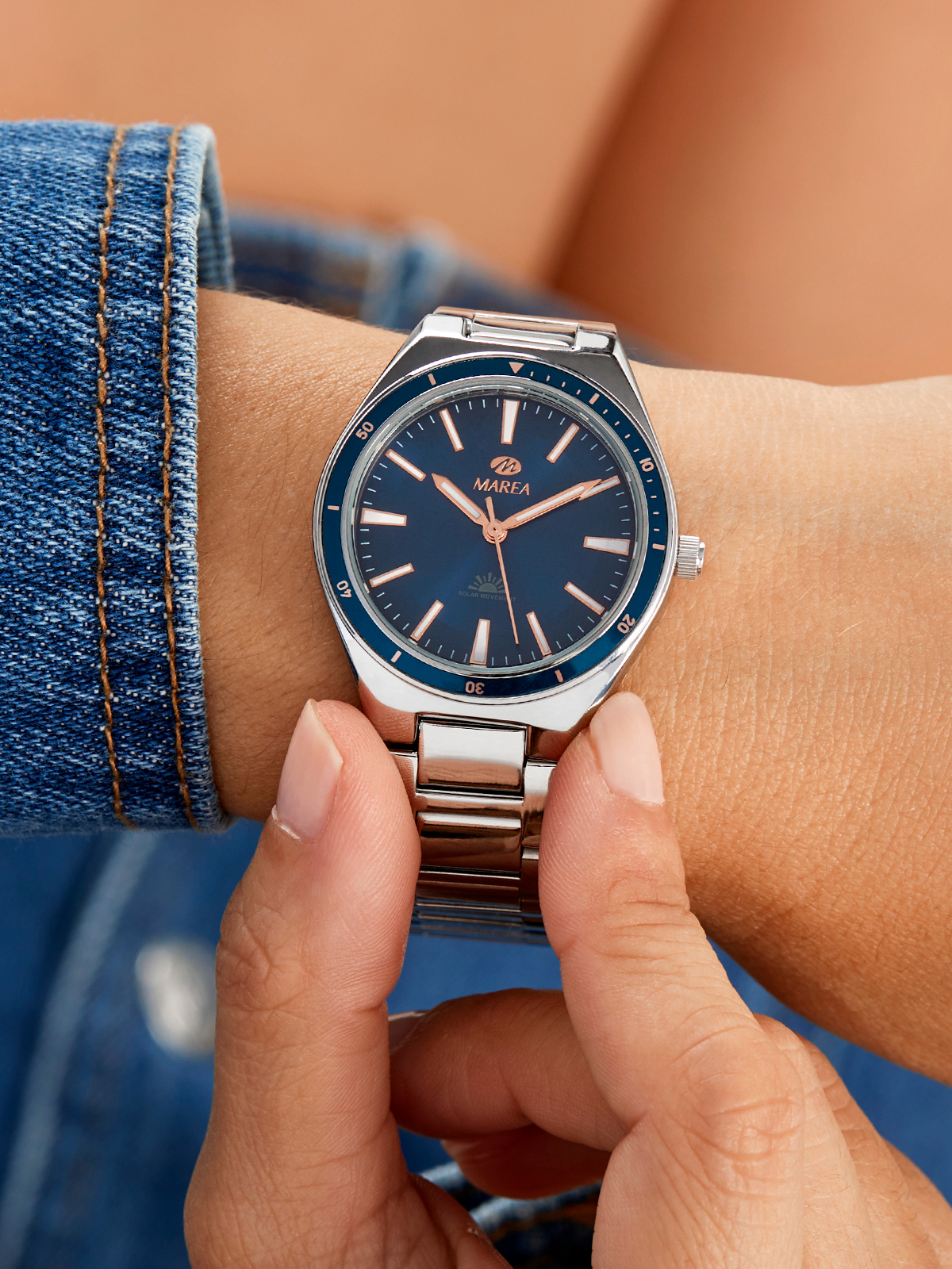 Material Caja: Metal con bisel color azul, con tapa trasera y corona de acero.