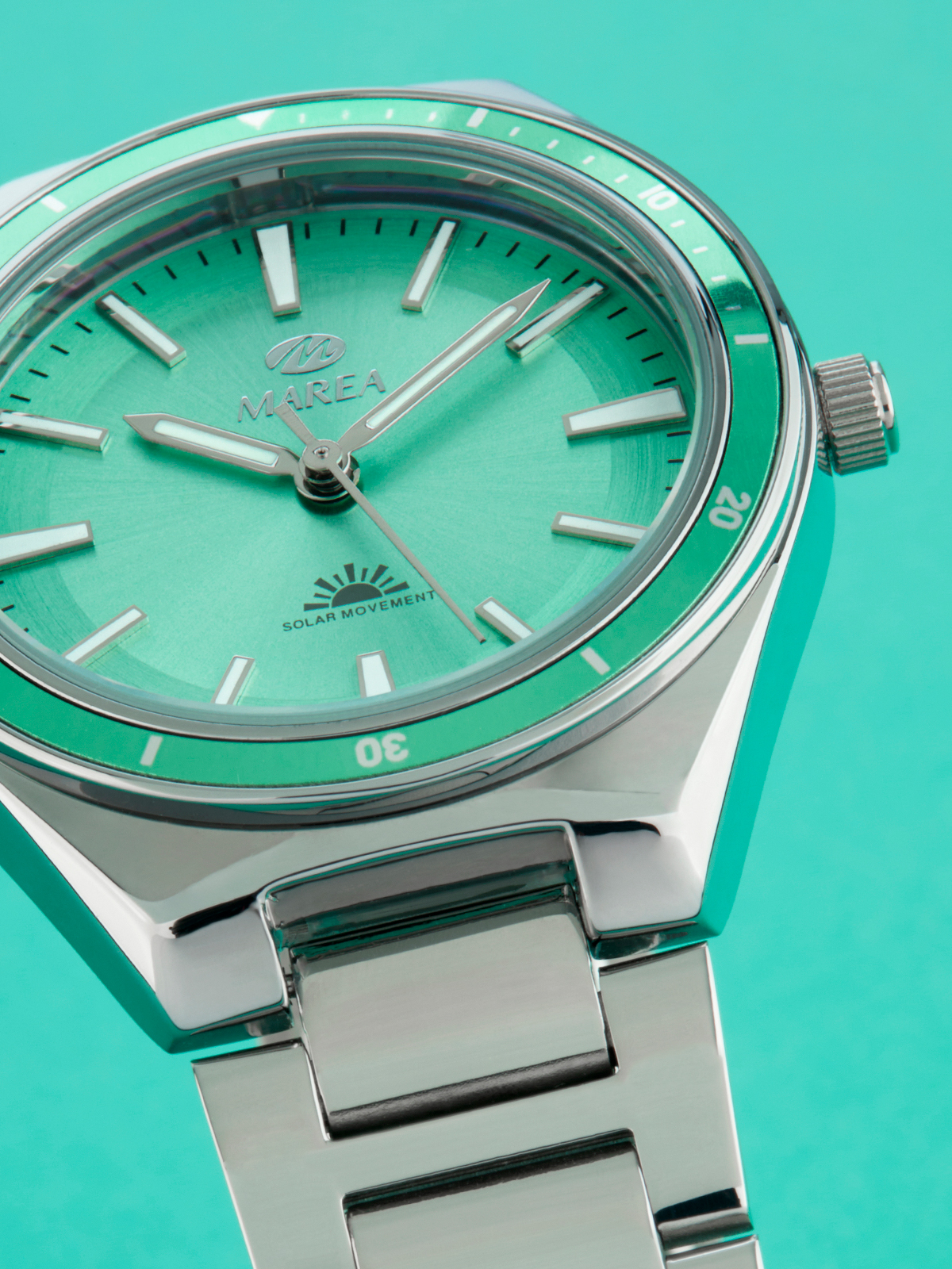 Movimiento japonés de carga solar: 3 agujas. Diámetro Caja: 34 mm. Material Caja: Metal con bisel color turquesa, con tapa trasera y corona de acero. Material Brazalete: Acero. Esfera: Color turquesa. Resistente al agua: 5 ATM.