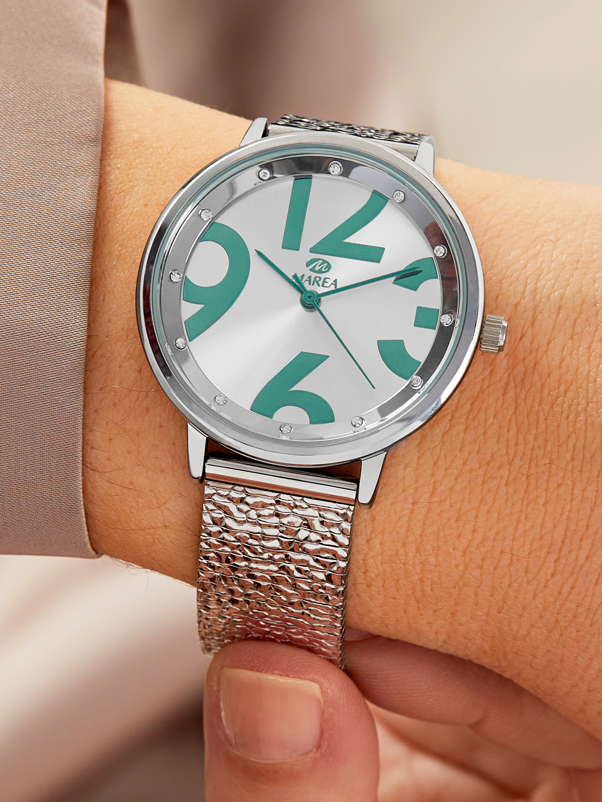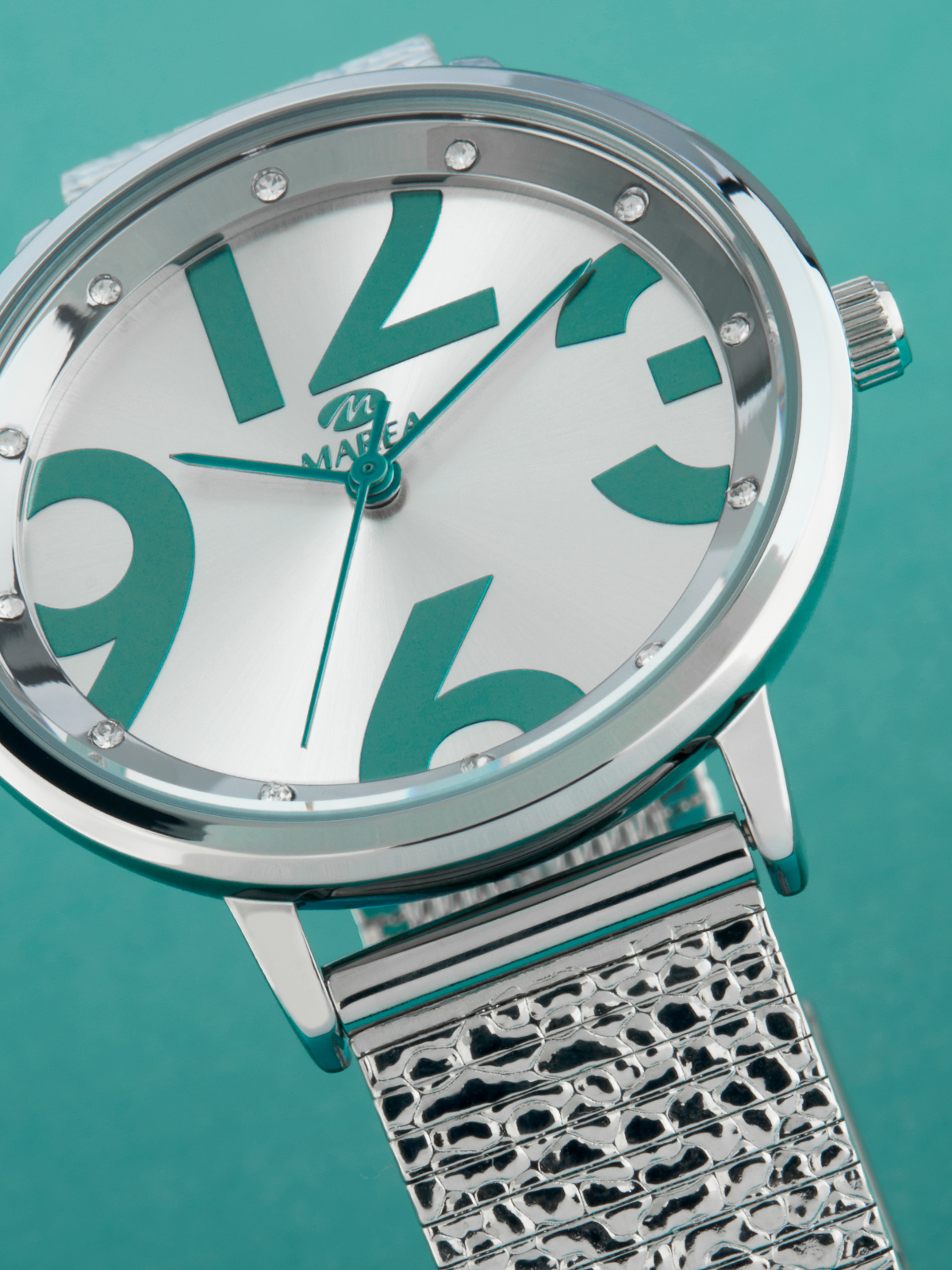 Esfera: Color plateado con detalles y agujas en color turquesa e índices de pedrería.