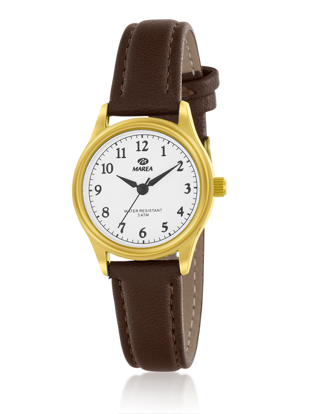 Movimiento japonés: 3 agujas. Diámetro Caja: 28 mm. Material Caja: Metal con tapa trasera y corona de acero. Material Brazalete: Piel color marrón oscuro con hebilla de acero. Esfera: Color blanco. Resistente al agua: 3 ATM.