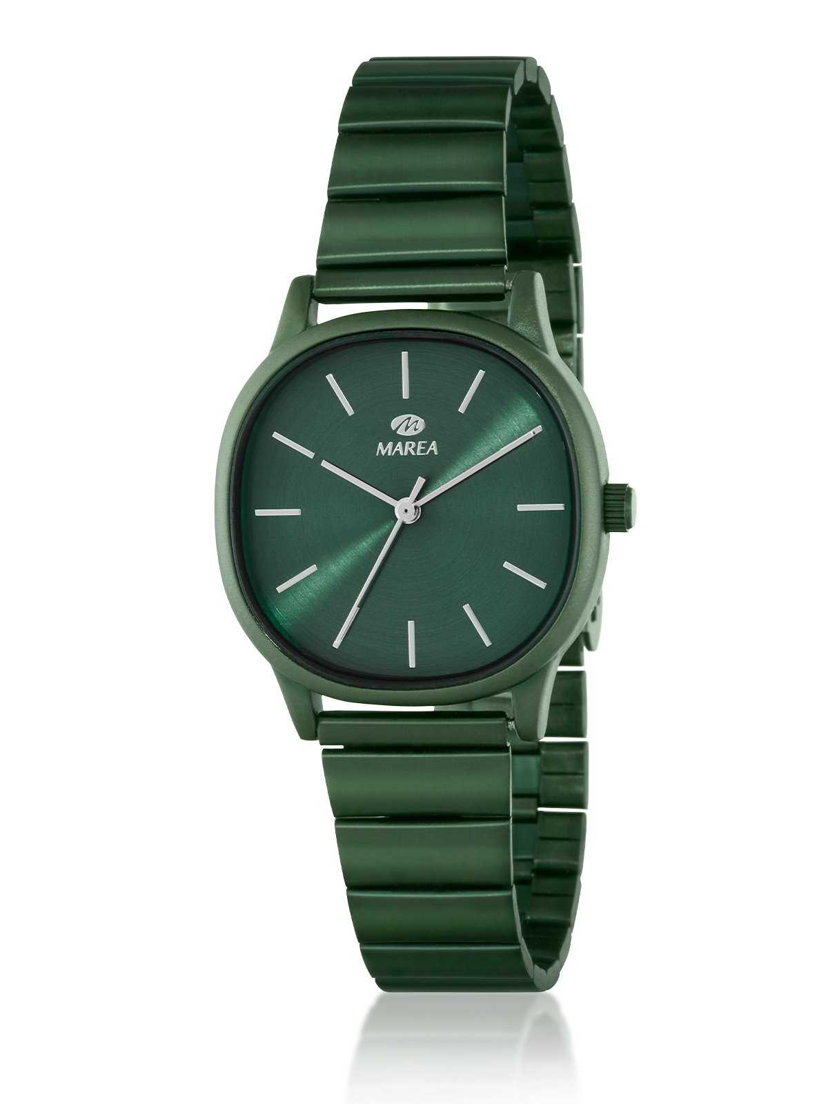 Movimiento japonés: 3 agujas Diámetro Caja: 32 mm. Material Caja: Metal. Material Brazalete: Acero/Steel Esfera: Color verde. Resistente al agua: 3 ATM