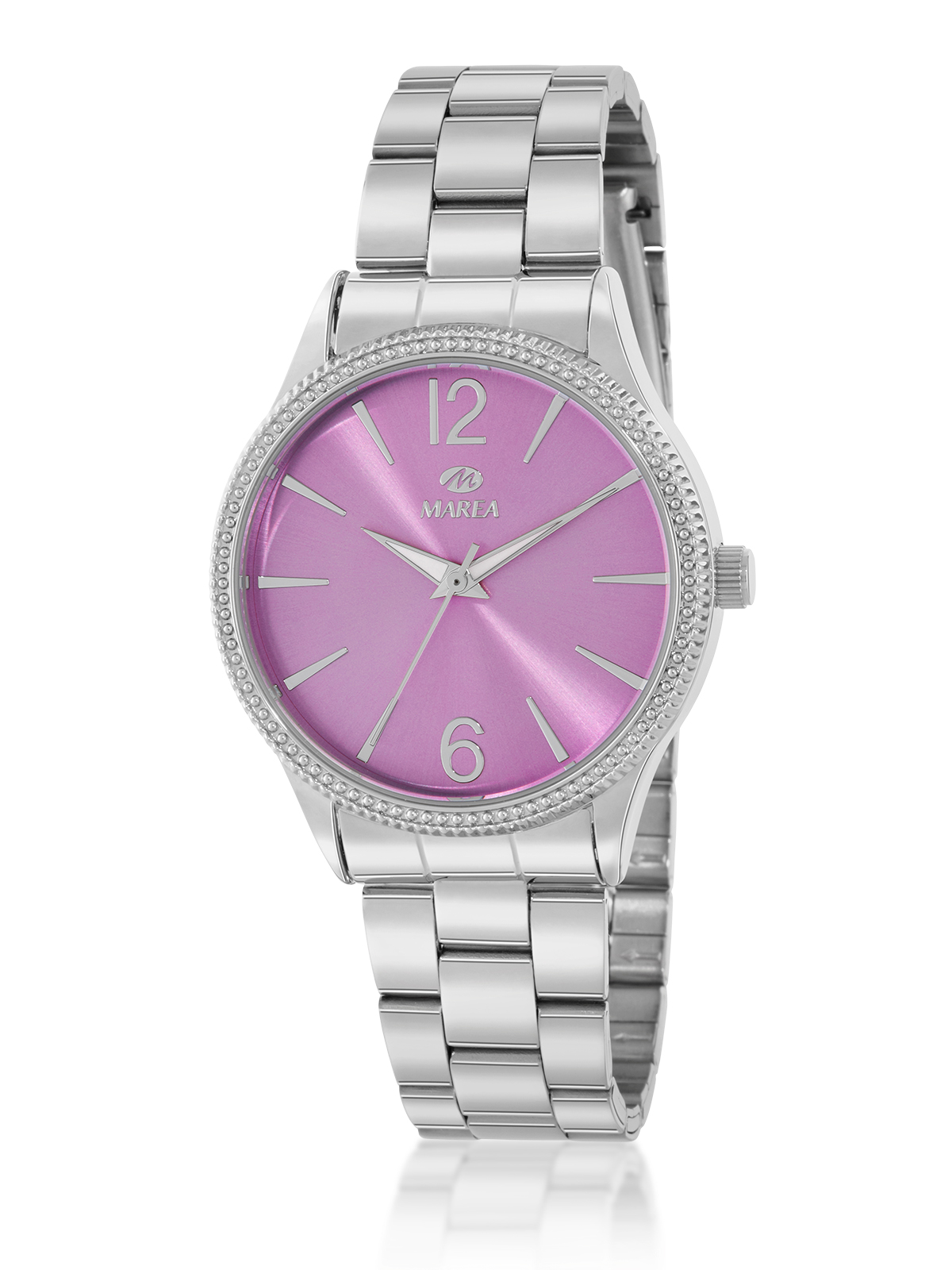 Movimiento japonés: 3 agujas Diámetro Caja: 36 mm. Material Caja: Metal. Material Brazalete: Acero/Steel Esfera: Color fucsia. Resistente al agua: 5ATM