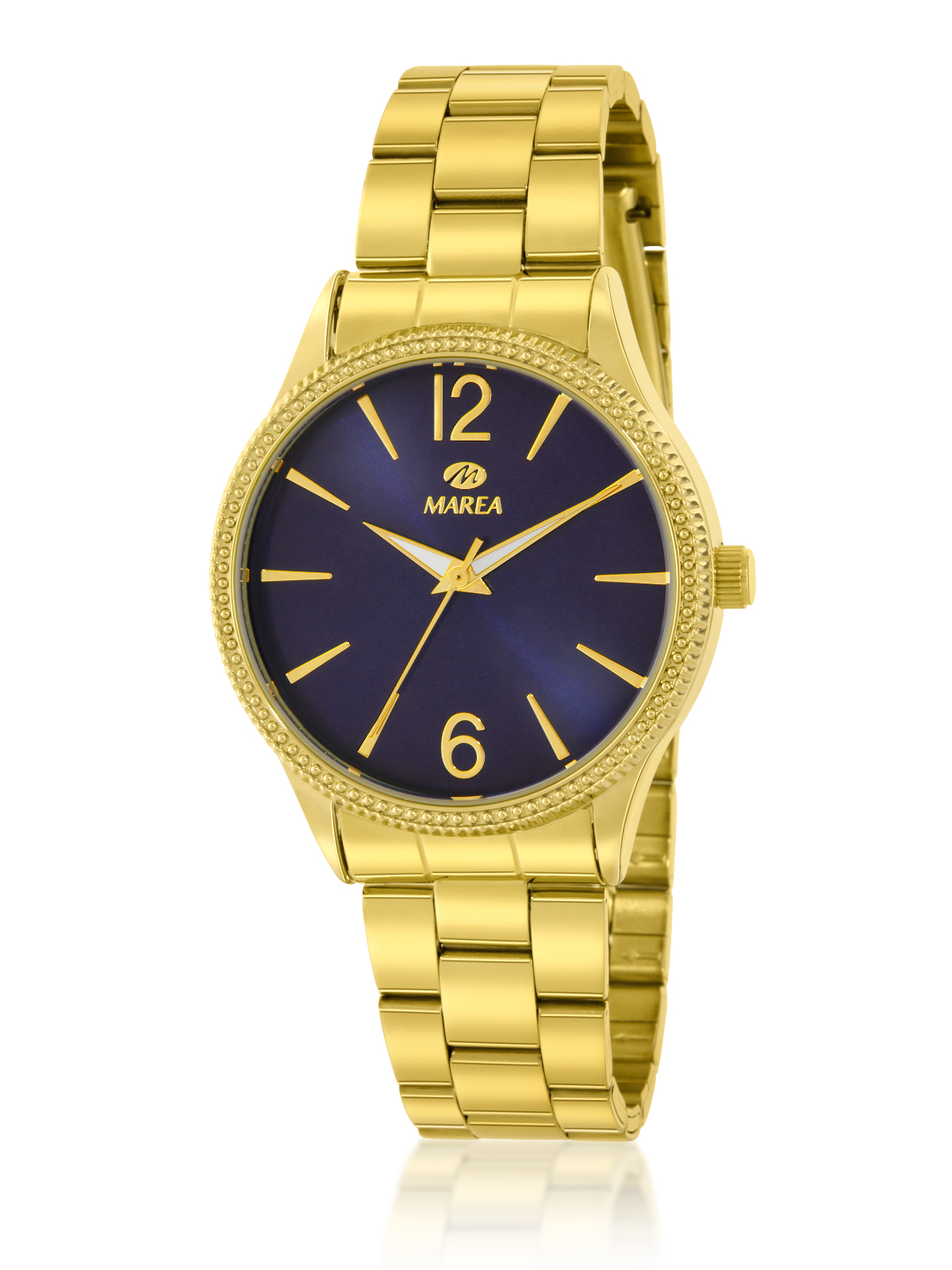 Movimiento japonés: 3 agujas Diámetro Caja: 36 mm. Material Caja: Metal. Material Brazalete: Acero/Steel Esfera: Color azul oscuro. Resistente al agua: 5ATM