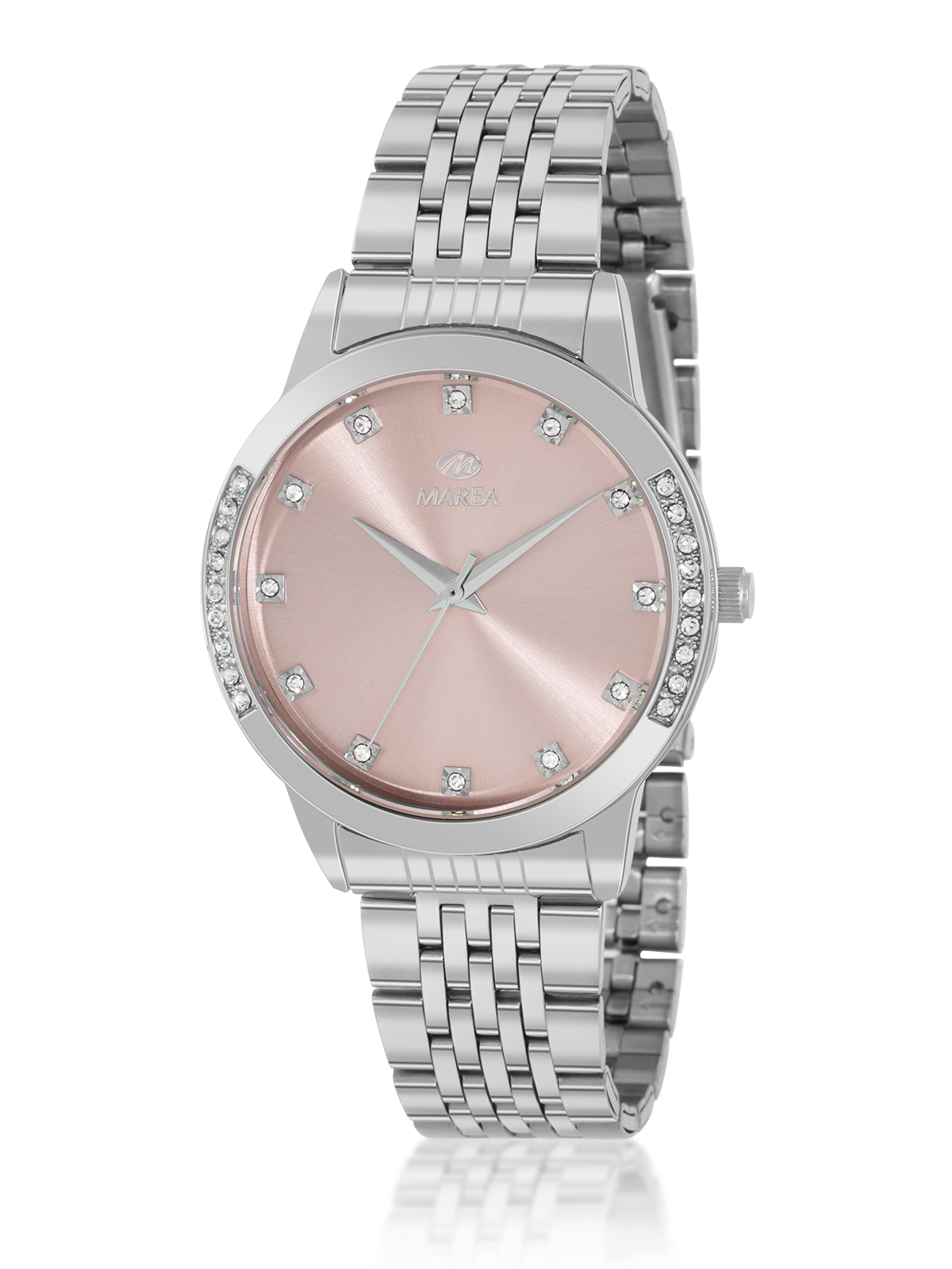 Movimiento japonés: 3 agujas. Índices y bisel con circonitas blancas y esfera rosa. Acabado plateado. Diámetro Caja: 37mm. Material Caja: Metal. Material Brazalete: Acero/Steel. Resistente al agua: 5ATM.