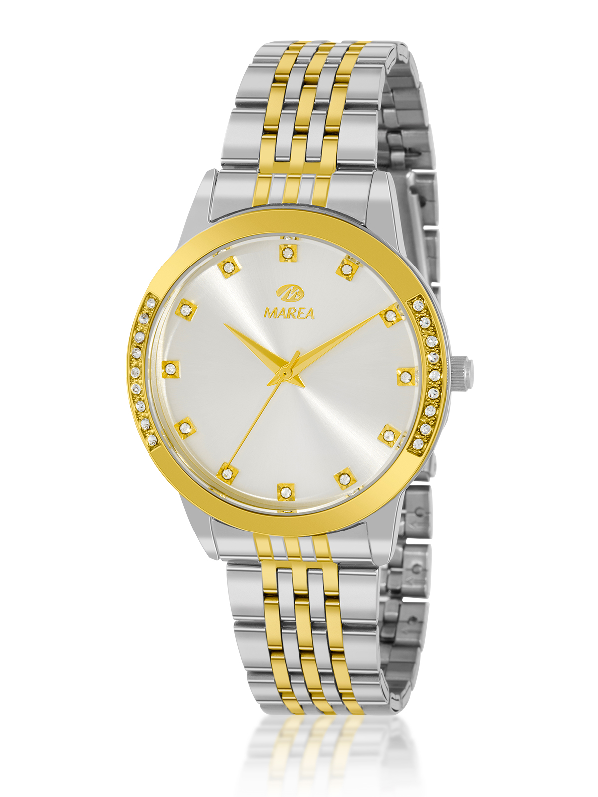 Movimiento japonés: 3 agujas. Índices y bisel con circonitas blancas y esfera blanca. Acabado bicolor. Diámetro Caja: 37mm. Material Caja: Metal. Material Brazalete: Acero/Steel. Resistente al agua: 5ATM.