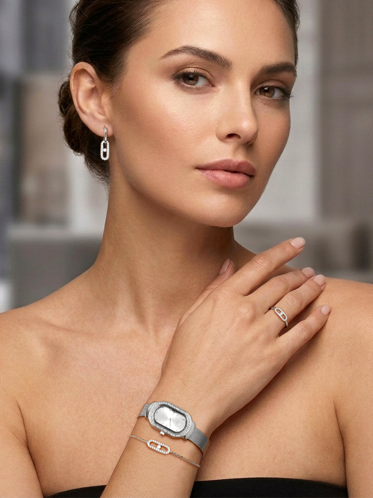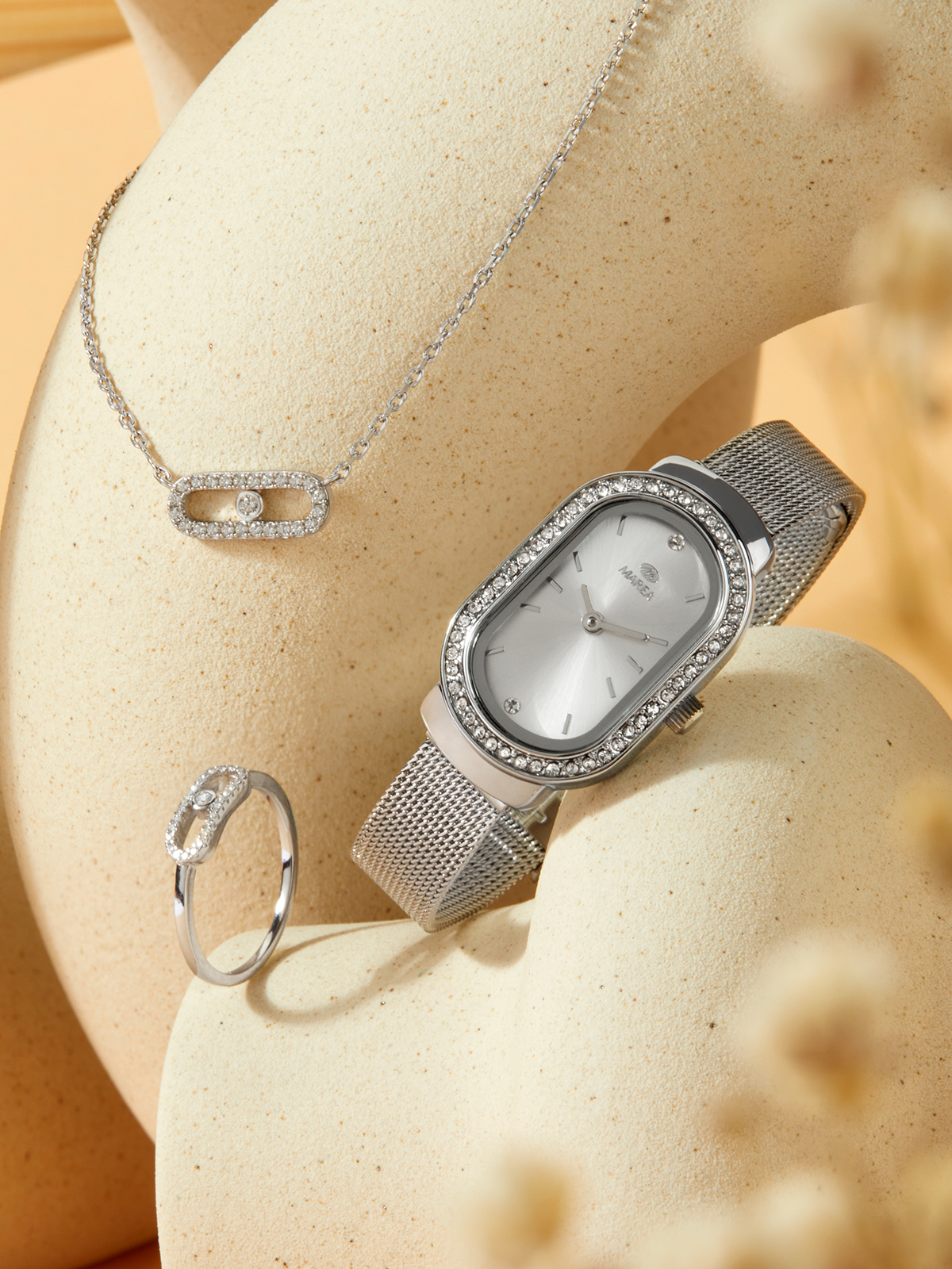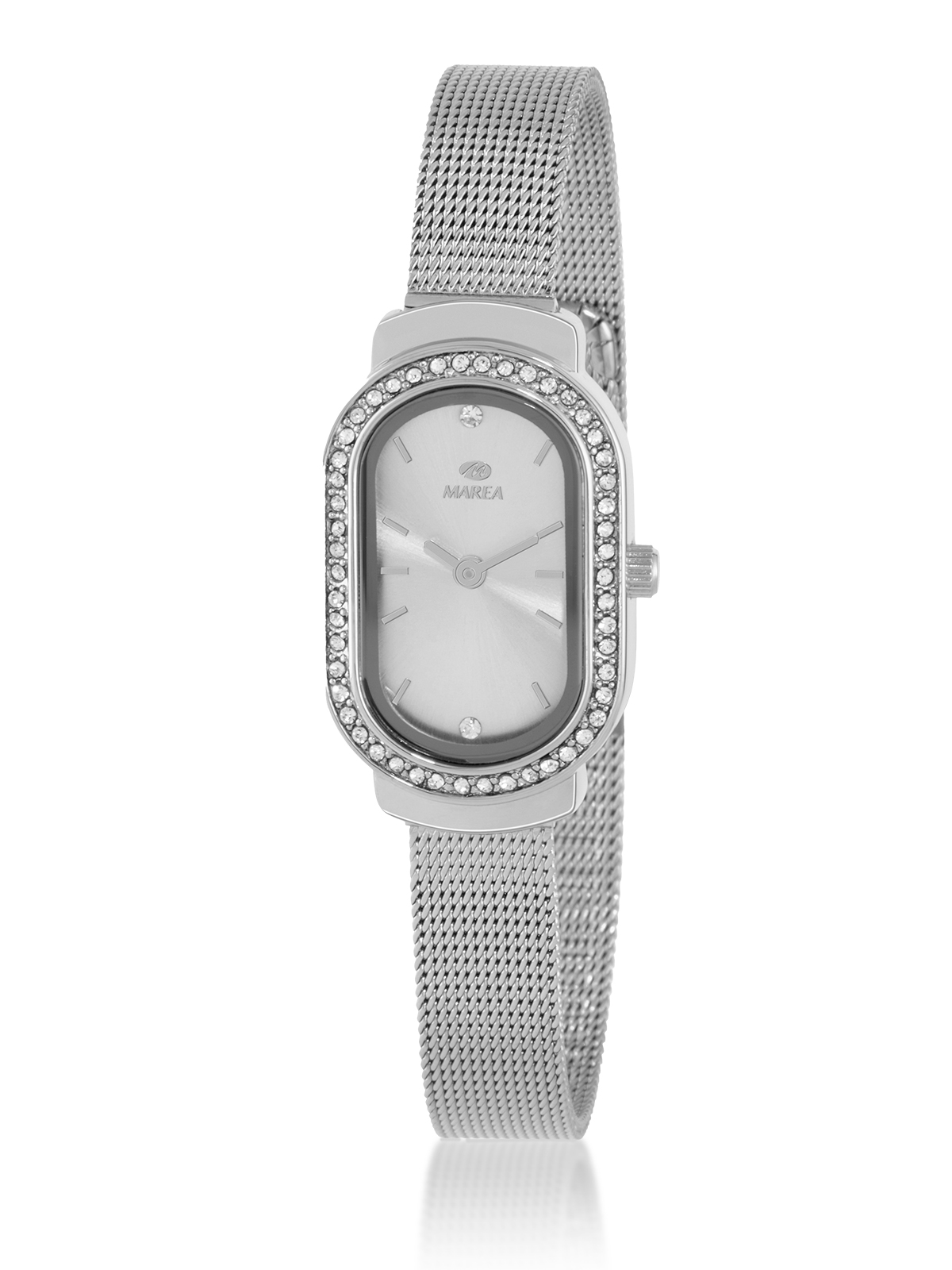 Reloj de mujer con elegante esfera ovalada y bisel decorado con circonitas brillantes. Correa de acero tipo malla milanesa y acabado plateado.