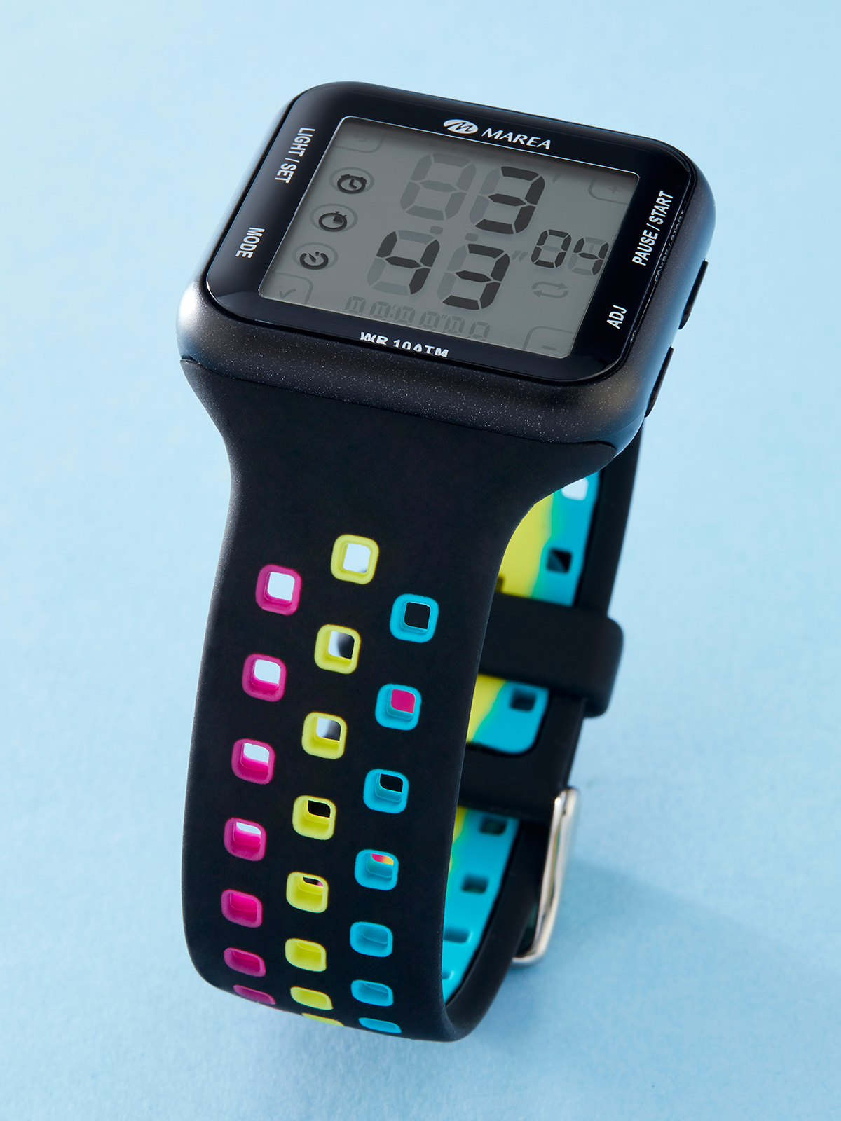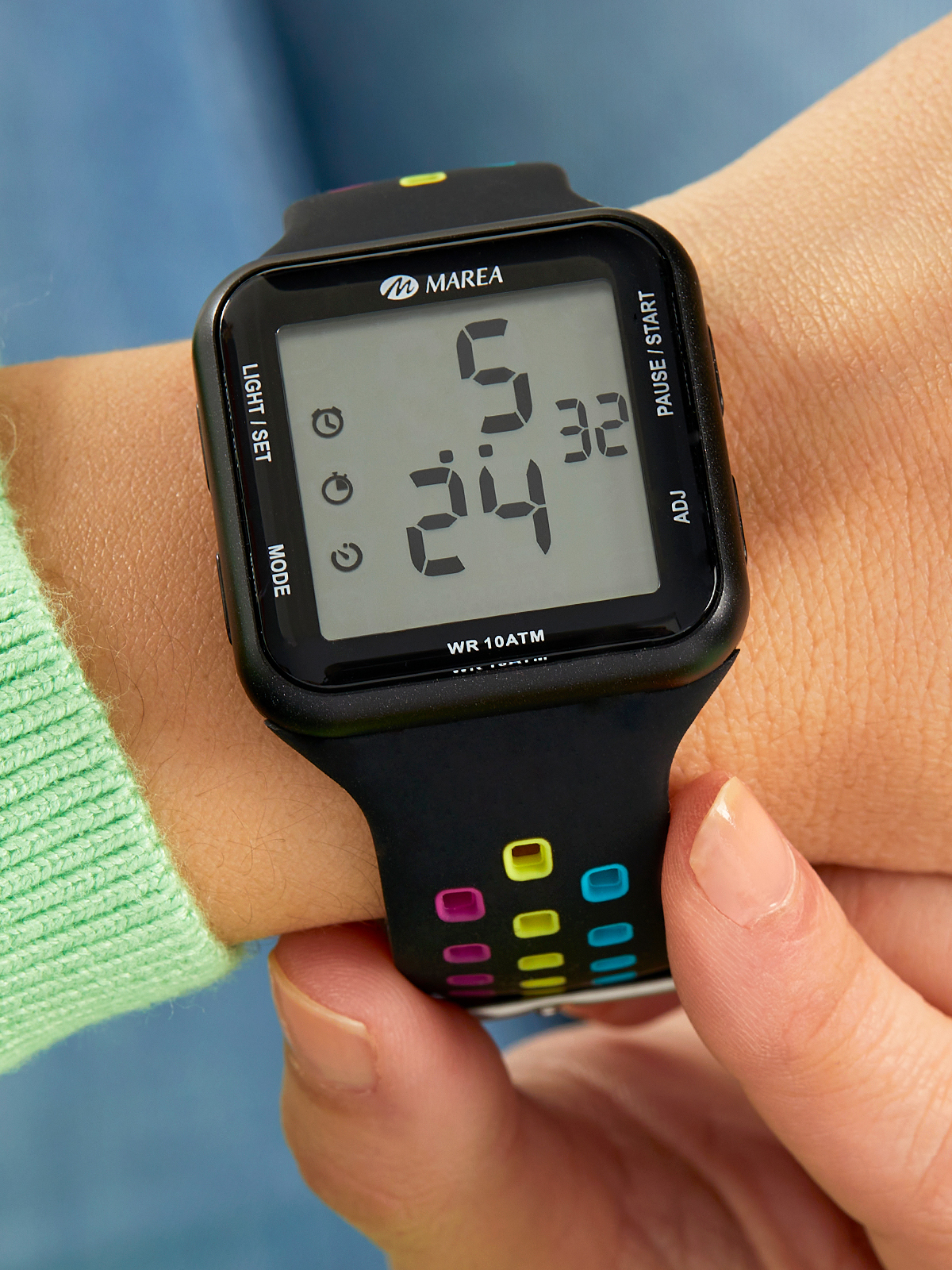 Funciones: cronómetro, cuenta atrás, alarma, luz, fecha, formato 12-24h