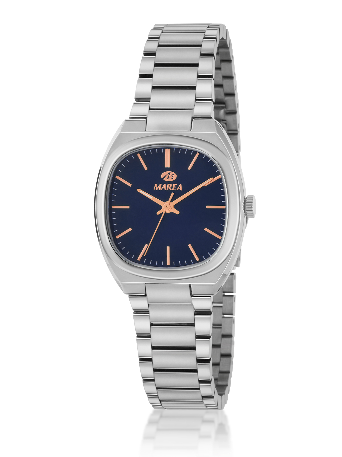 Movimiento japonés: 3 agujas Diámetro Caja: 30 mm. Material Caja: Metal. Material Brazalete: Acero/Steel Esfera: Color azul oscuro con índices en color rose gold. Resistente al agua: 3ATM