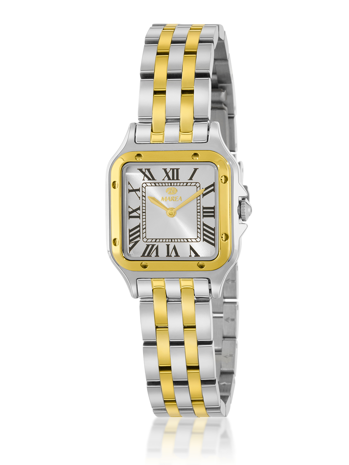 Movimiento japonés: 3 agujas Diámetro Caja: 26mm. Material Caja: Metal. Material Brazalete: Acero/Steel Esfera: Color blanco con agujas de color dorado. Resistente al agua: 3ATM