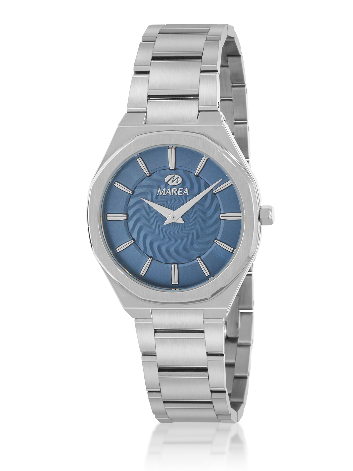 Reloj de mujer con esfera azul y correa de armis plateado.
