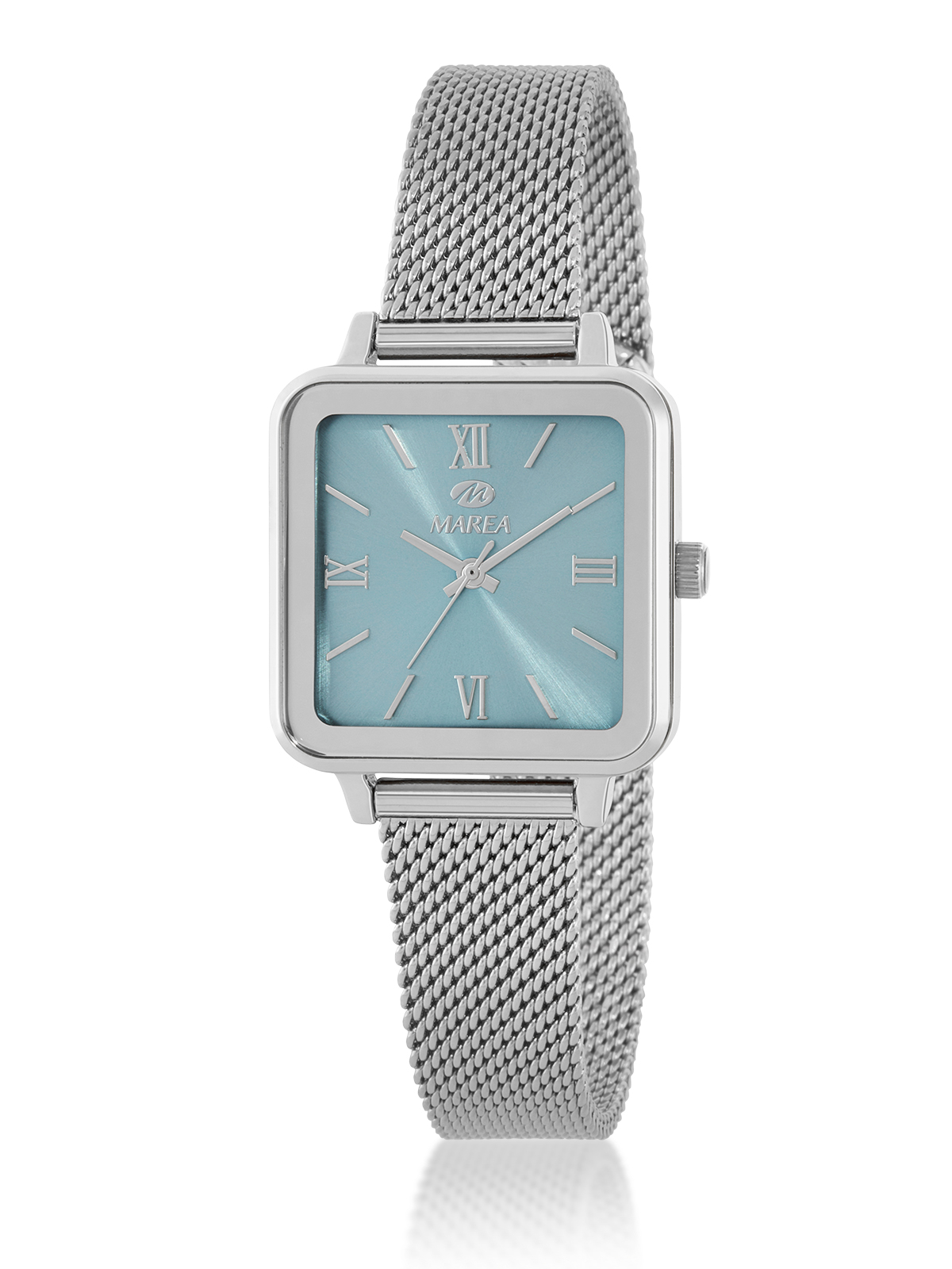 Movimiento japonés de tres agujas. Esfera cuadrada en color azul claro con correa de malla milanesa. Acabado plateado.