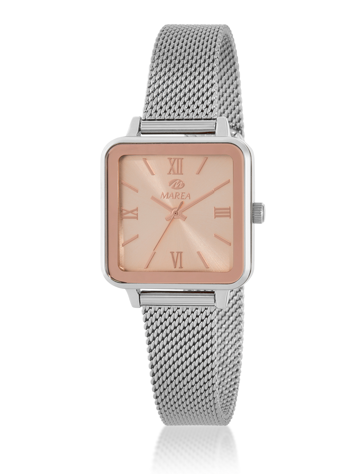 Movimiento japonés de tres agujas. Esfera cuadrada en color rosa palo con correa de malla milanesa. Acabado plateado.