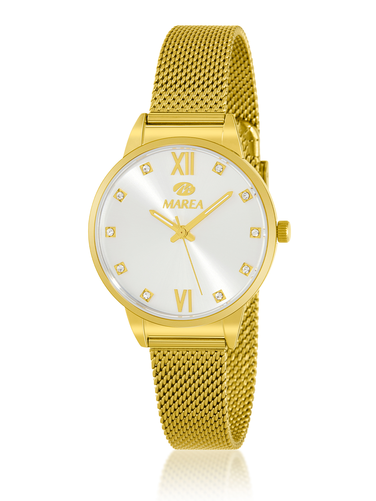 Reloj con movimiento japonés: 3 agujas. Esfera de color blanco. Acabado dorado. Diámetro Caja: 34mm. Material Caja: Acero/Steel. Material Brazalete: Acero/Steel. Resistente al agua: 3 ATM.