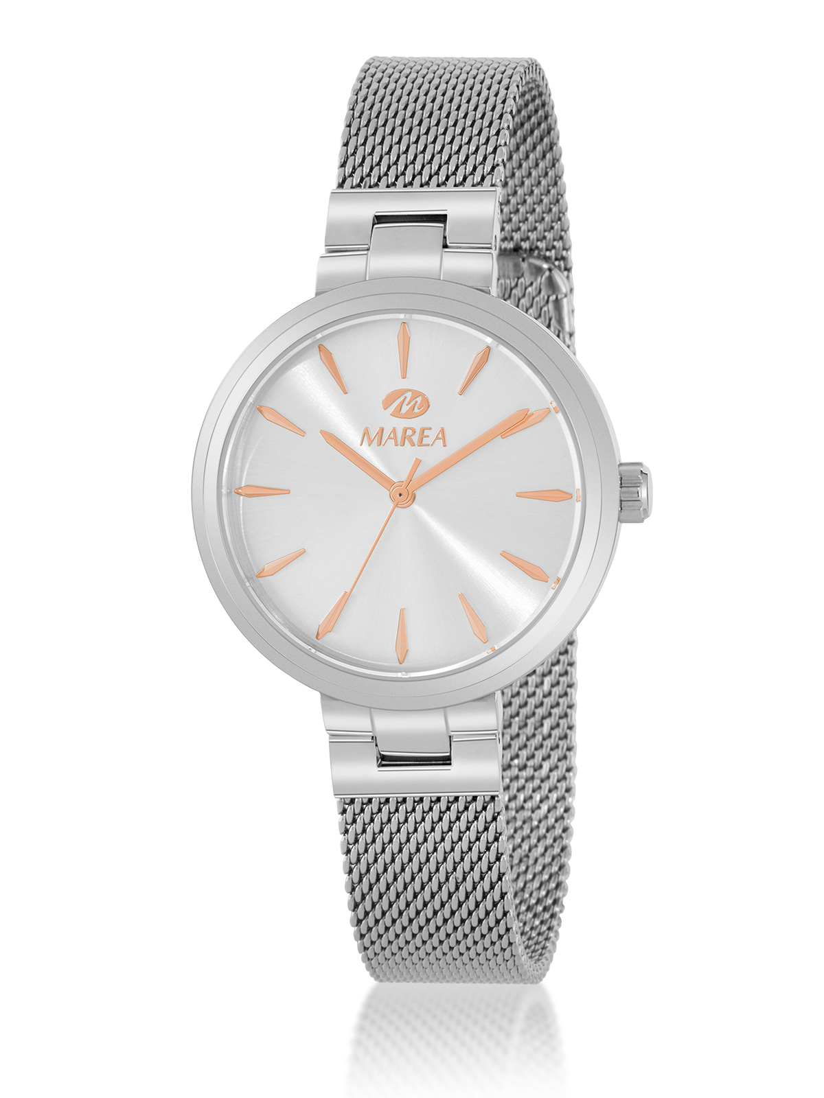 Movimiento japonés: 3 agujas Diámetro Caja: 35mm. Material Caja: Acero/Steel. Material Brazalete: Acero/Steel. Esfera: Color blanco con índices y agujas de color rose gold. Resistente al agua: 3ATM