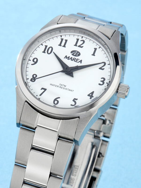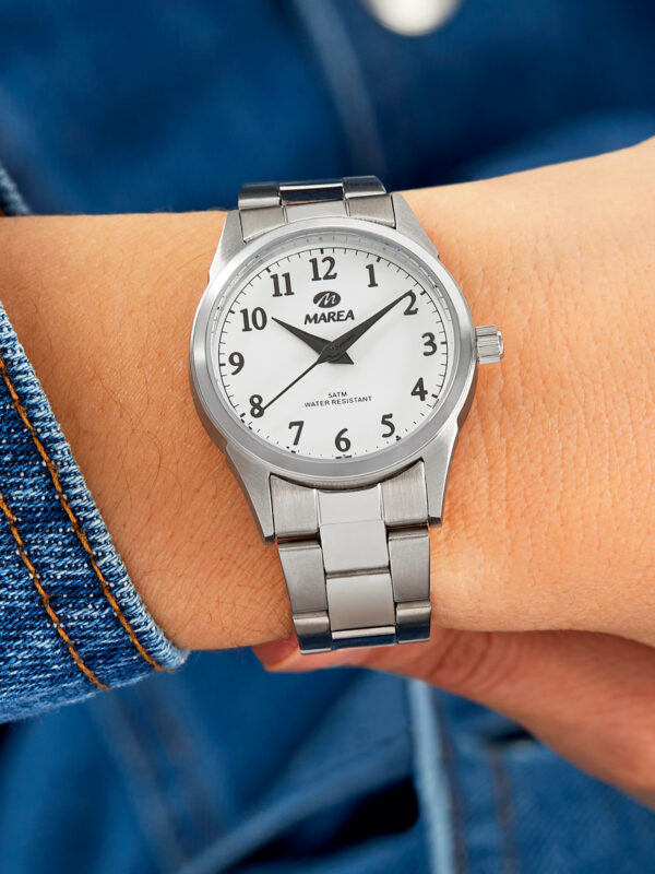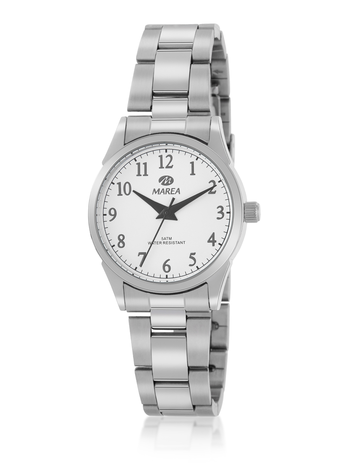 Movimiento japonés: 3 agujas Diámetro Caja: 30 mm. Material Caja: Acero Material Brazalete: Acero Esfera: Color blanco con índices rectos Resistente al agua: 5 ATM