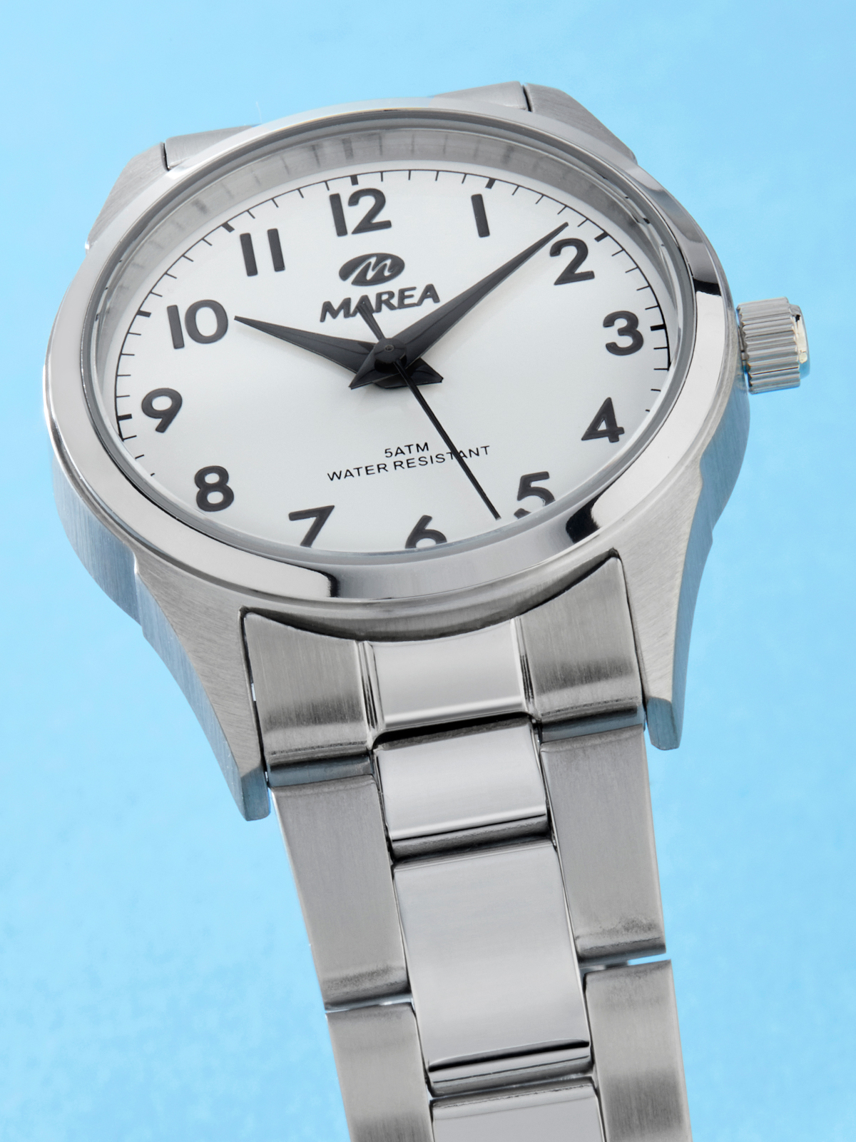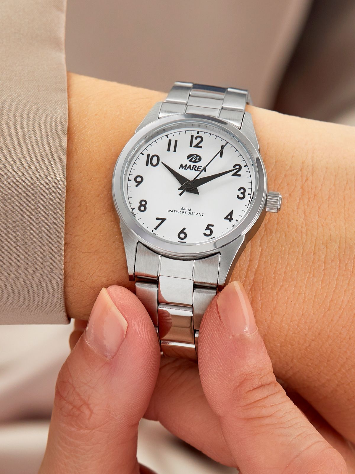 Movimiento japonés: 3 agujas Diámetro Caja: 30 mm. Material Caja: Acero Material Brazalete: Acero Esfera: Color blanco con índices rectos Resistente al agua: 5 ATM