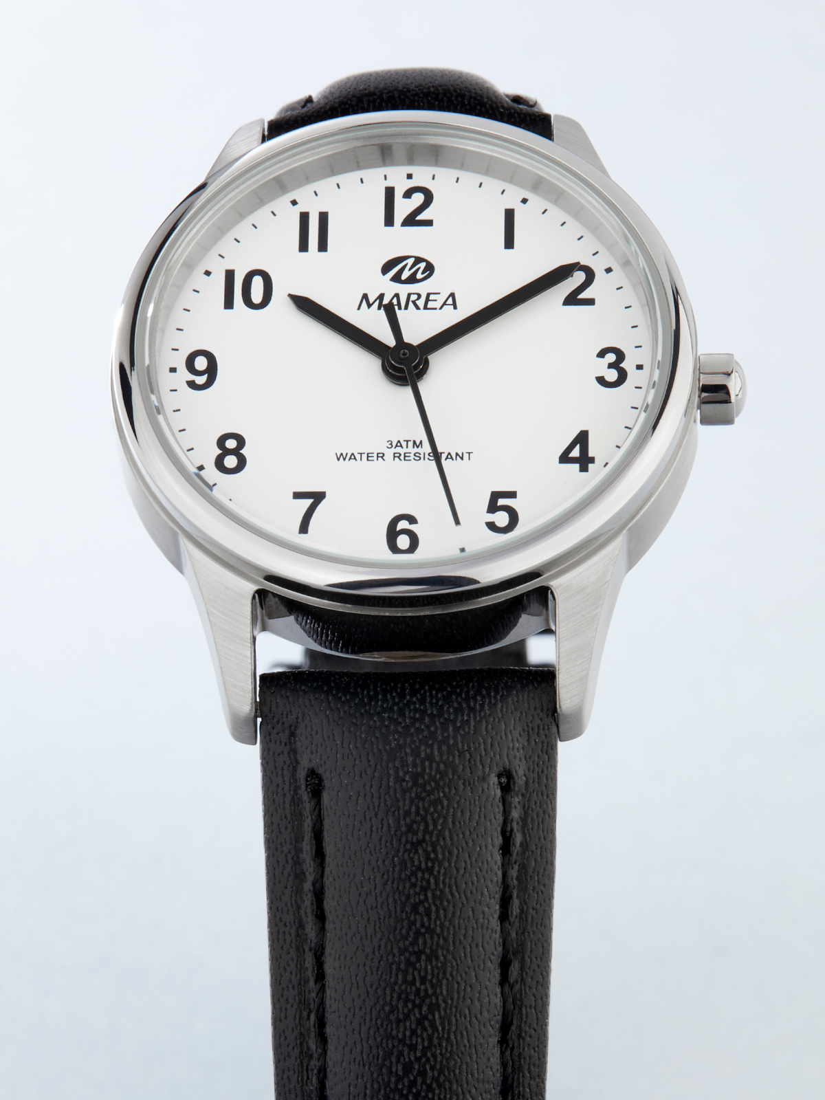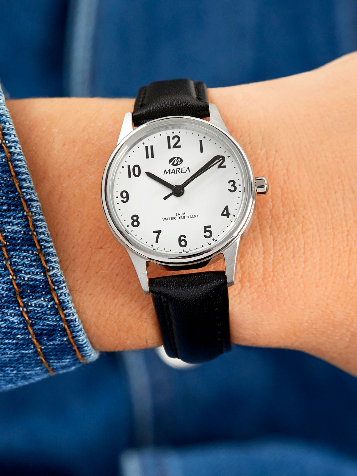 Movimiento japonés: 3 agujas Diámetro Caja: 28 mm. Material Caja: Acero Material Brazalete: Piel color negro Esfera: Color blanco Resistente al agua: 3 ATM