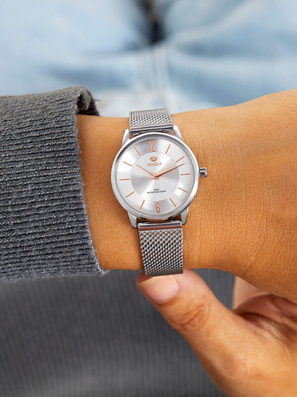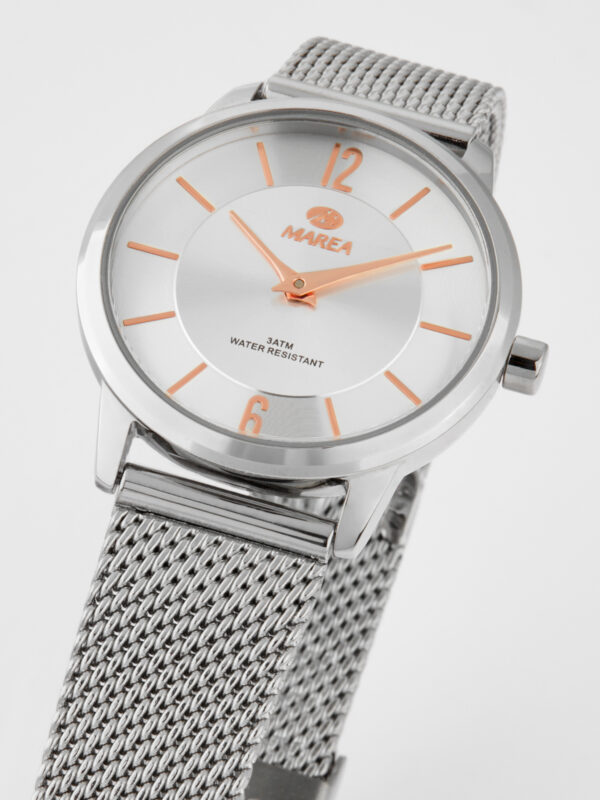 Movimiento japonés: 3 agujas Diámetro Caja: 28 mm. Material Caja: Acero. Material Brazalete: Acero. Esfera: Color lanco con índices y agujas en color rosegold. Resistente al agua: 3 ATM