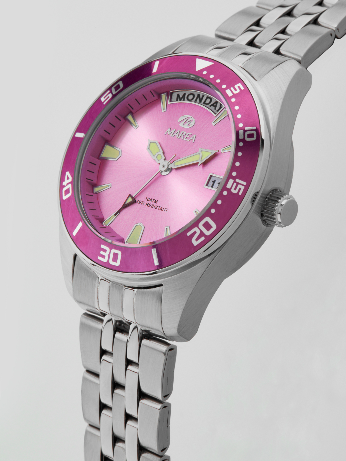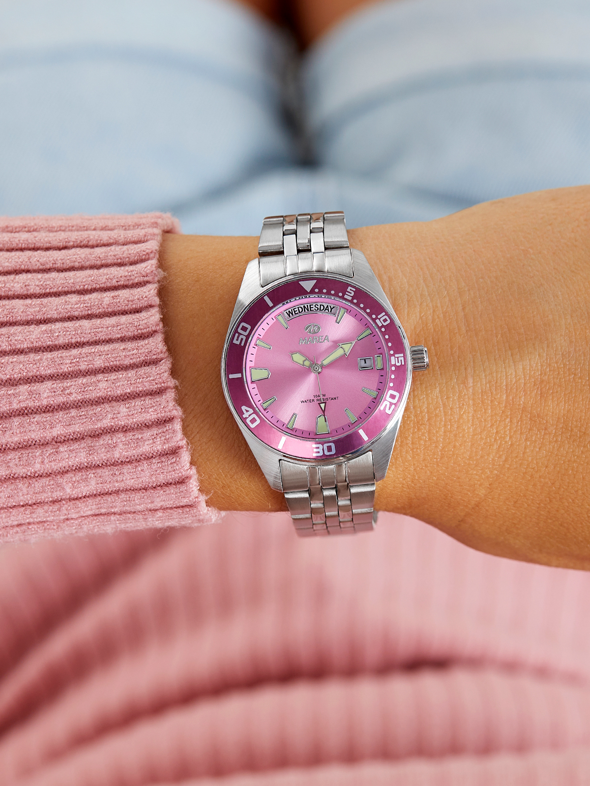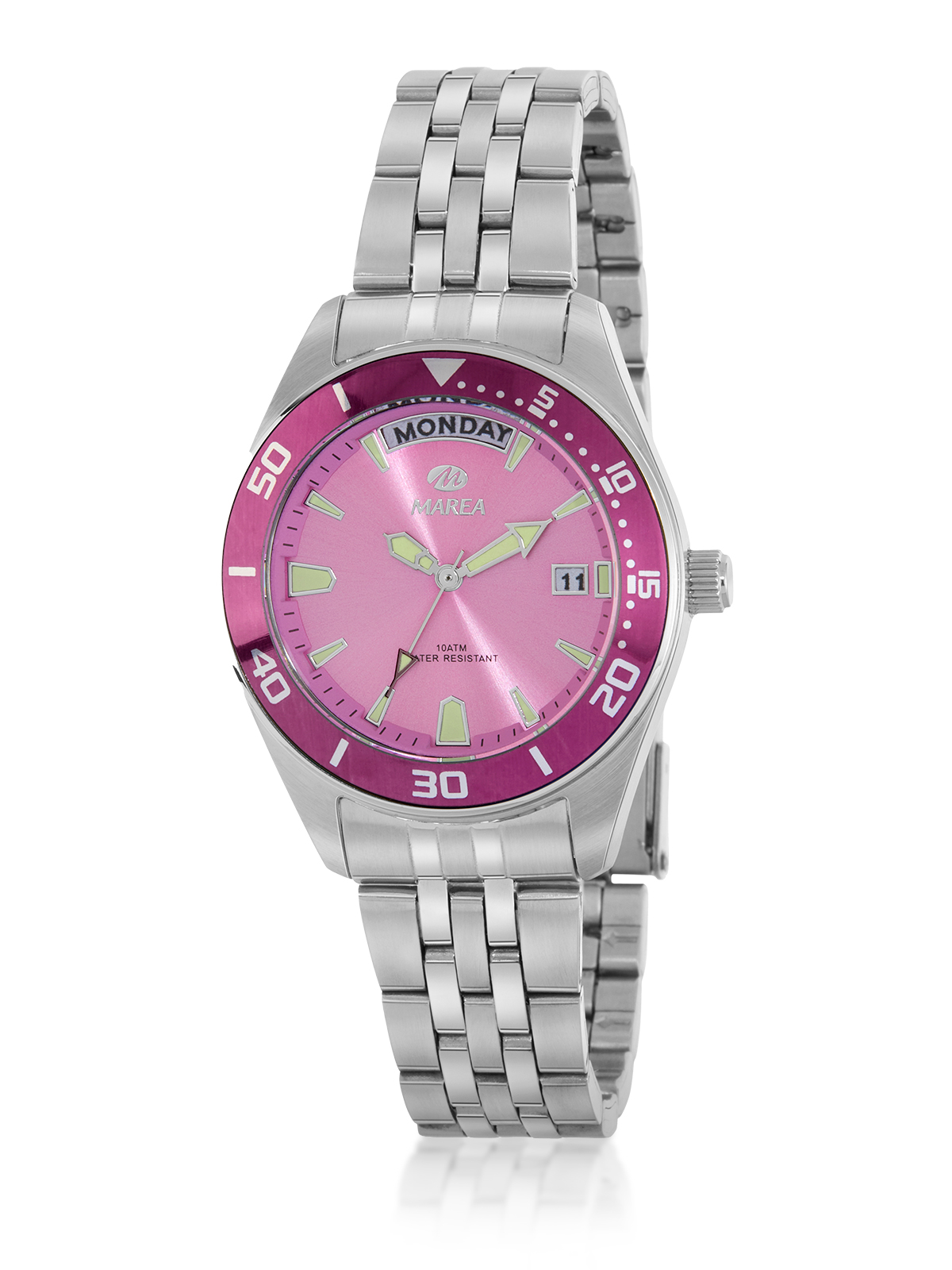 Movimiento japonés: 3 agujas STEEL. Diámetro Caja: 33 mm. Material Caja: Acero/Steel. Material Brazalete: Acero. Esfera: Color rosa. Resistente al agua: 10 ATM.
