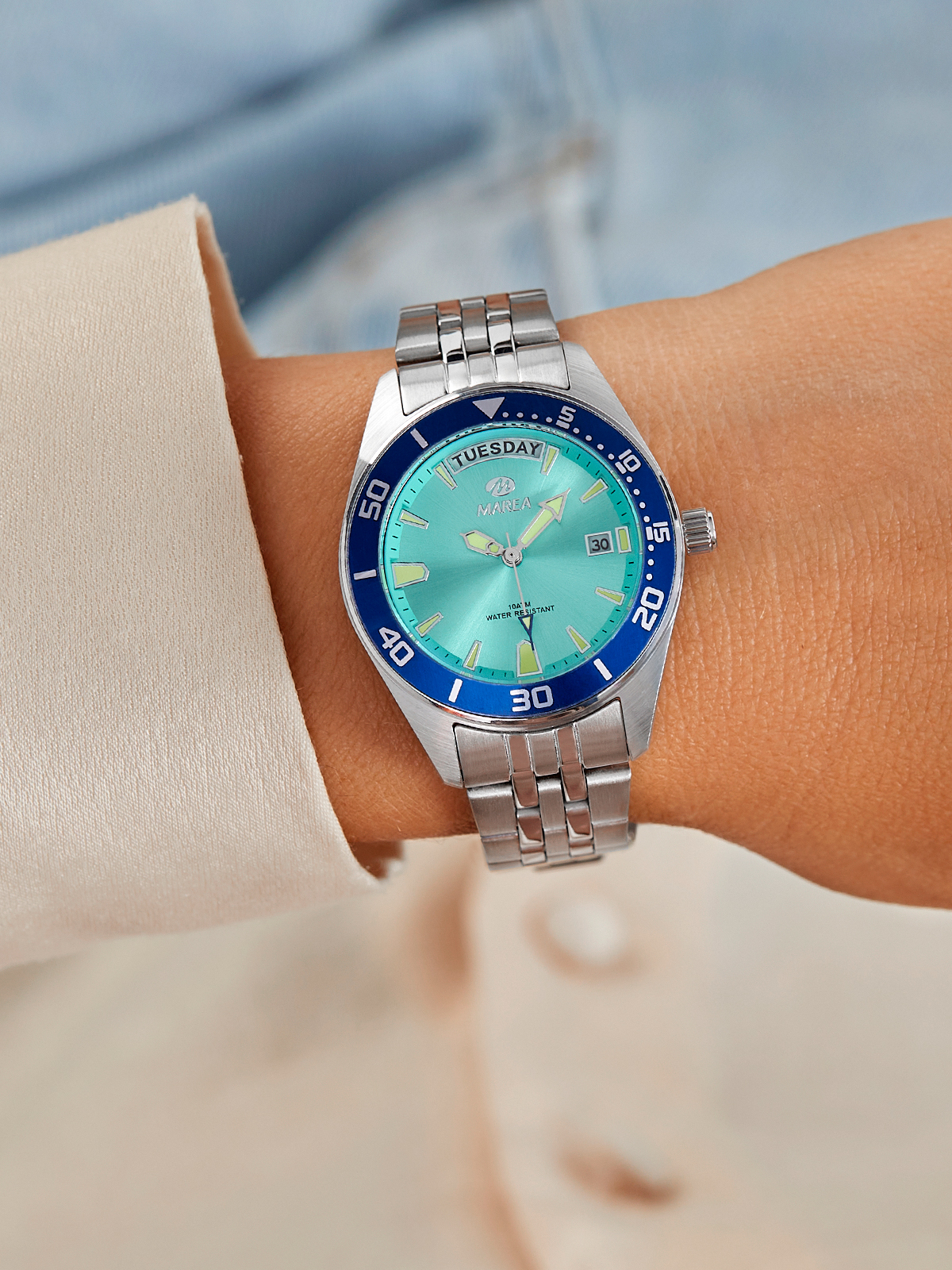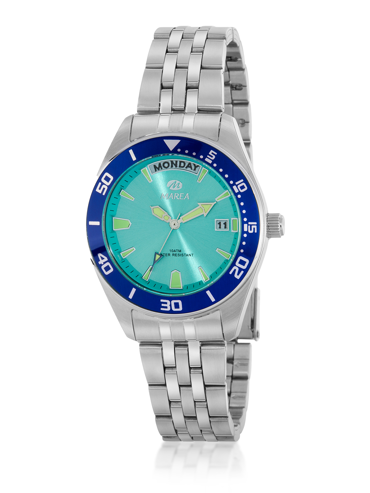 Movimiento japonés: 3 agujas STEEL. Diámetro Caja: 33 mm. Material Caja: Acero/Steel. Material Brazalete: Acero. Esfera: Color azul. Resistente al agua: 10 ATM.