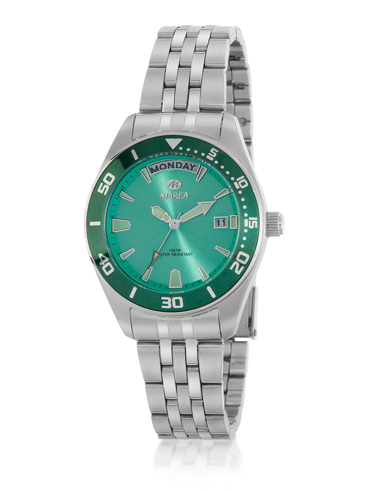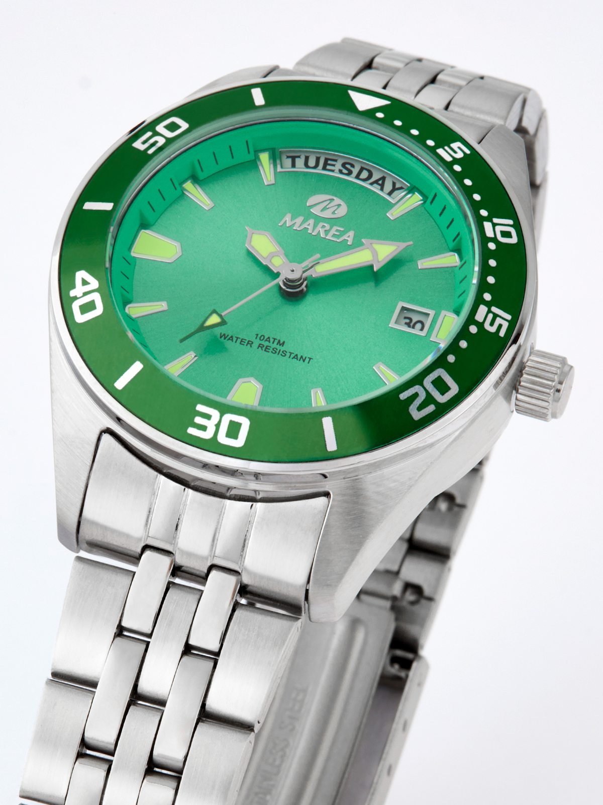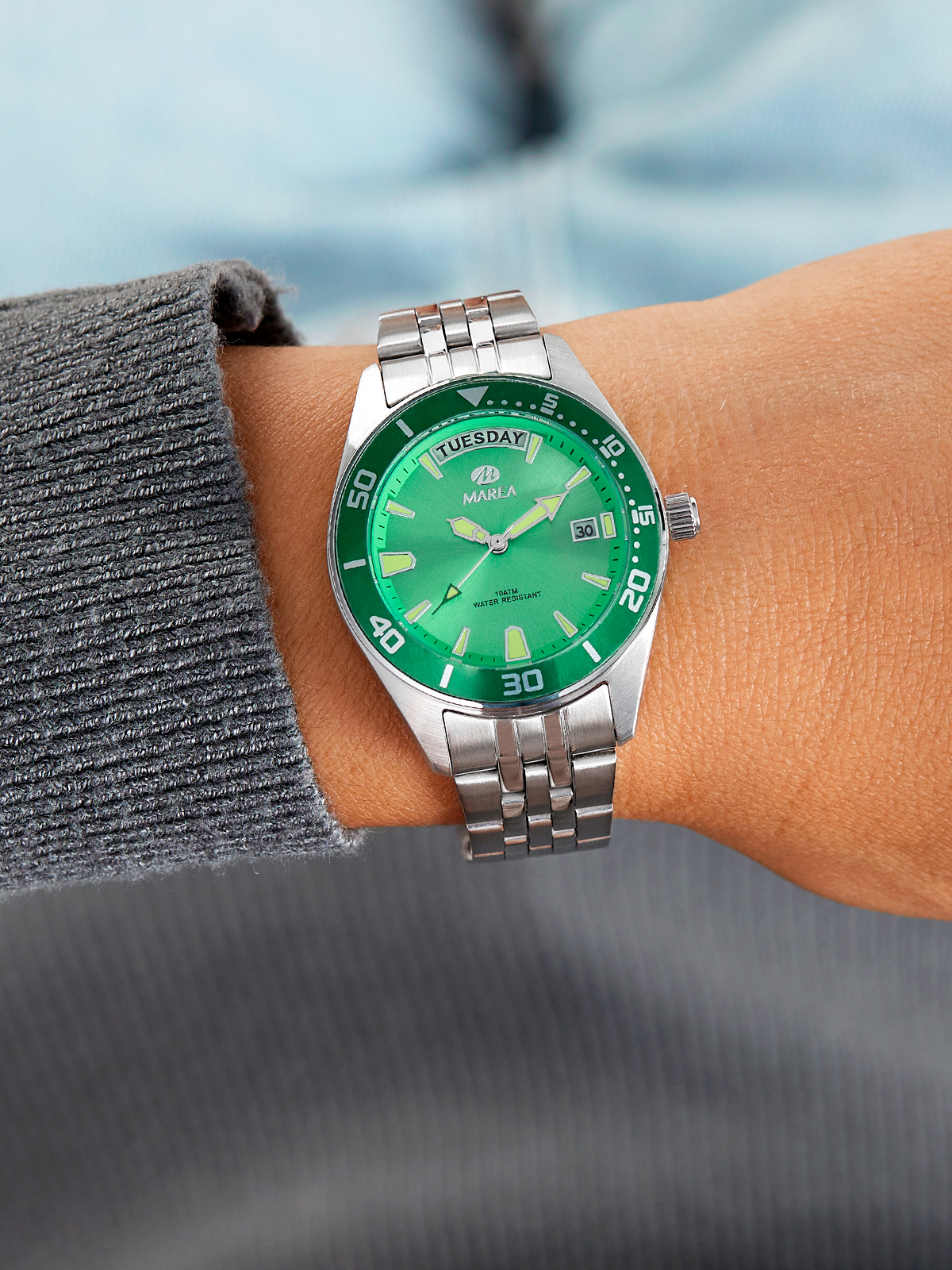 Movimiento japonés: 3 agujas STEEL. Diámetro Caja: 33 mm. Material Caja: Acero/Steel. Material Brazalete: Acero. Esfera: Color verde. Resistente al agua: 10 ATM.