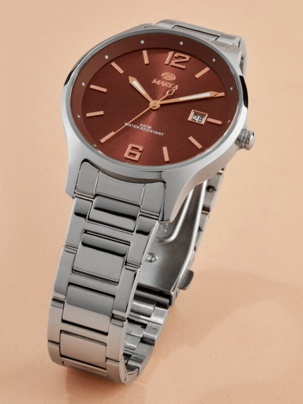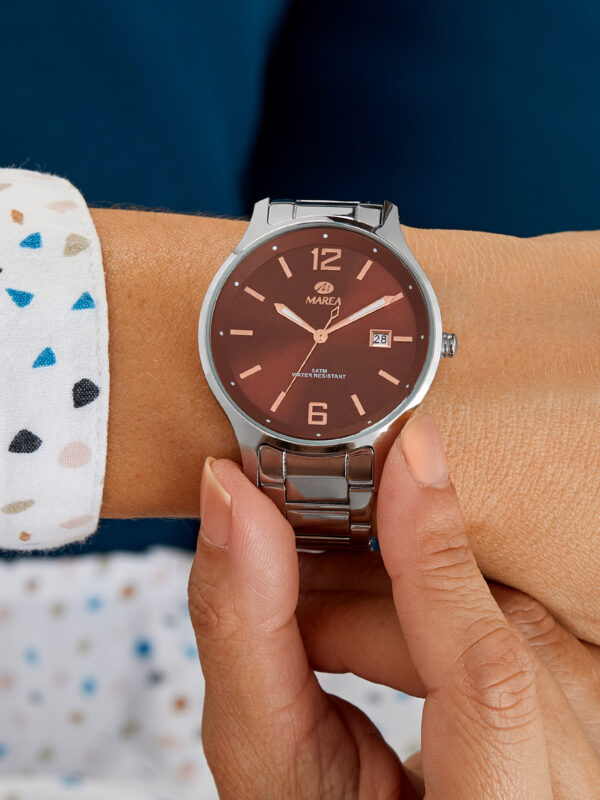 Movimiento japonés: 3 agujas Diámetro Caja: 34mm. Material Caja: Acero/Steel. Material Brazalete: Acero/Steel. Esfera: Color granate con índices y agujas de color rose gold. Resistente al agua: 5ATM
