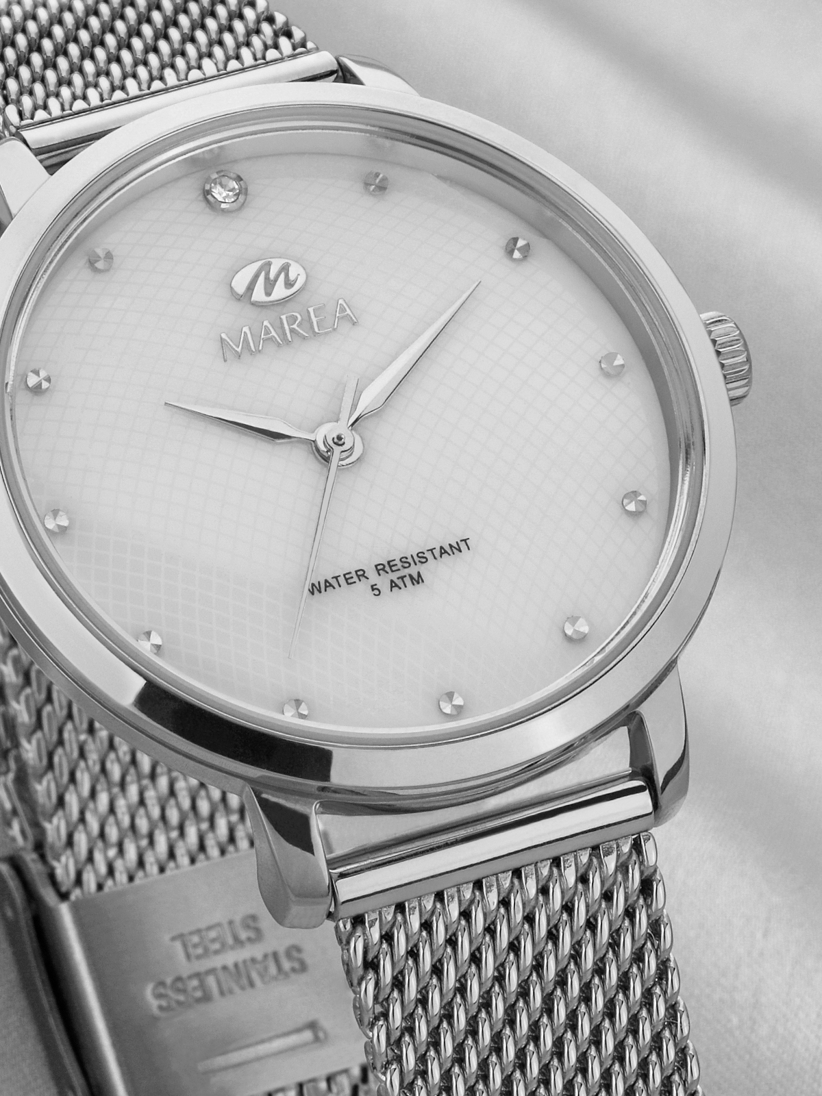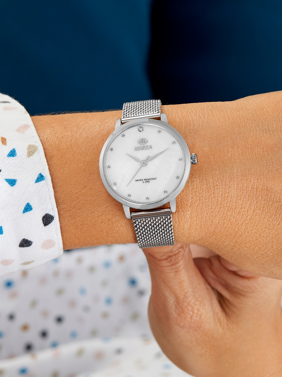 Movimiento japonés: 3 agujas. Diámetro Caja: 32 mm. Material Caja: Acero. Material Brazalete: Acero. Esfera: Color blanco nacarado con índices de pedrería. Resistente al agua: 5 ATM.