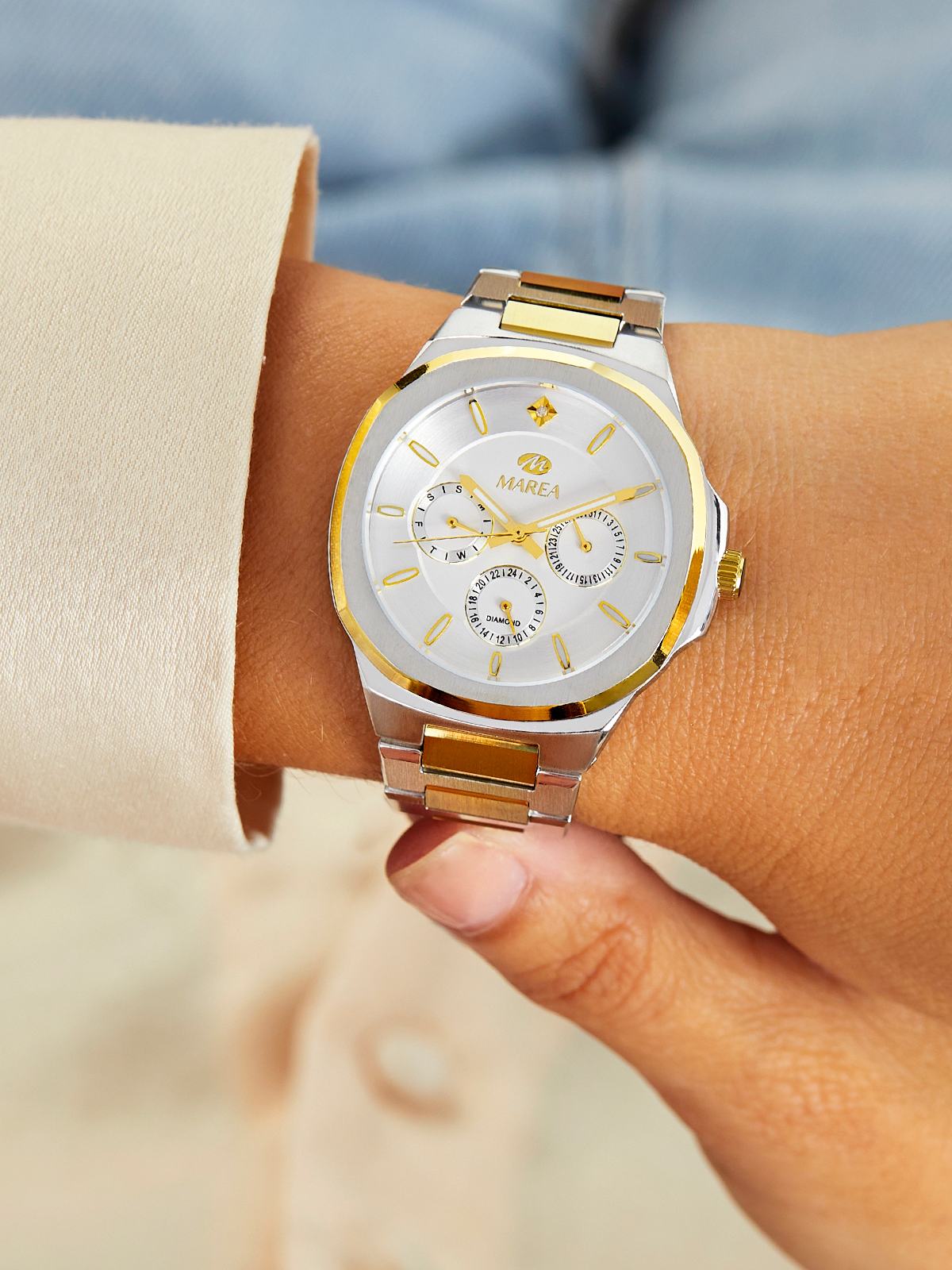 Esfera: Color plata con índices y agujas en color dorado y punta de diamante en las 12.