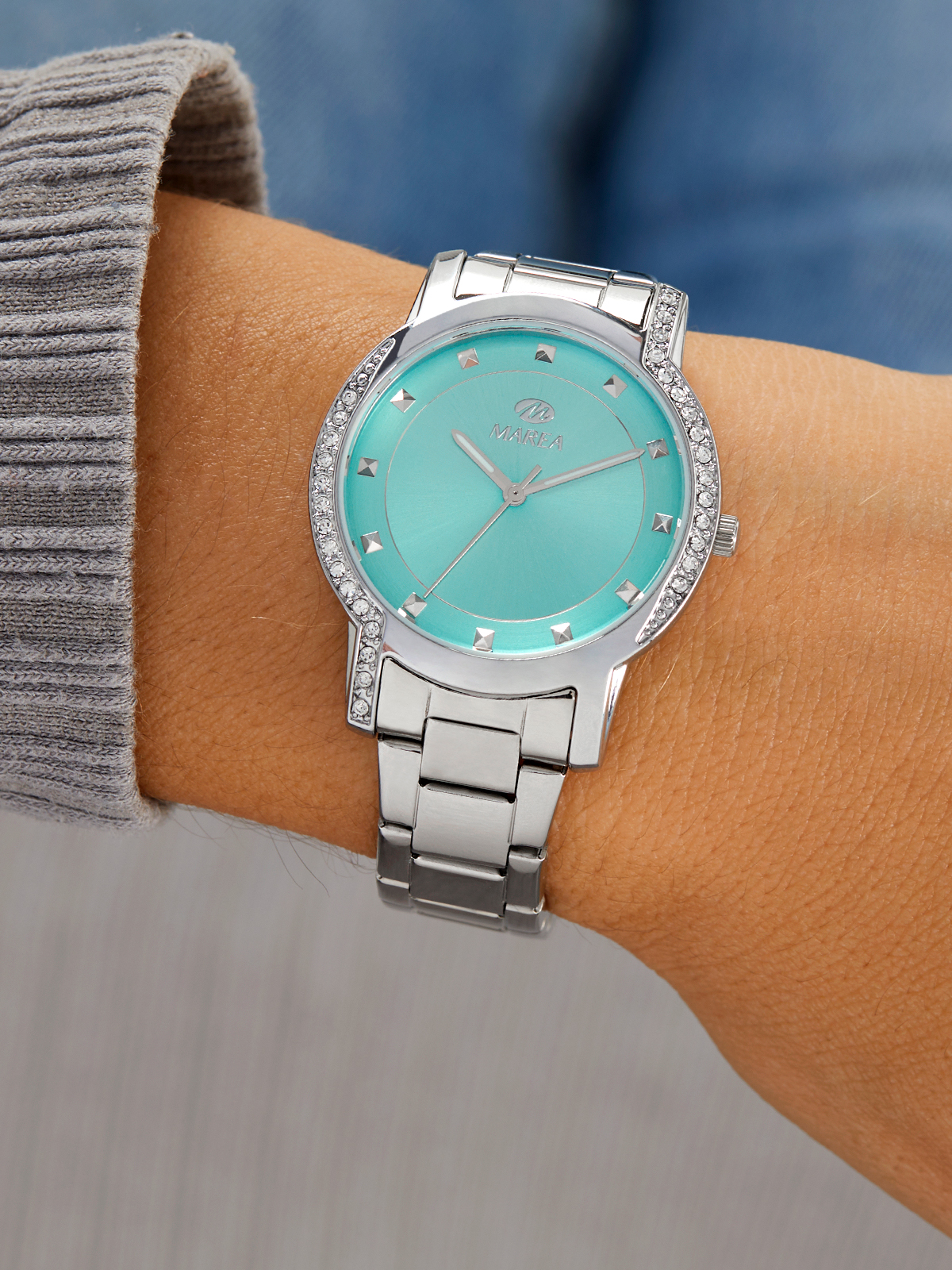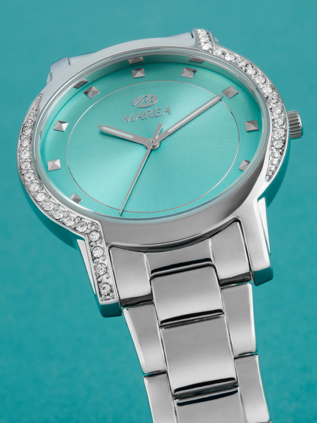 Movimiento japonés: 3 agujas. Diámetro Caja: 34 mm. Material Caja: Metal con circonitas. Material Brazalete: Acero/Steel. Esfera: Azul turquesa. Resistente al agua: 3 ATM.
