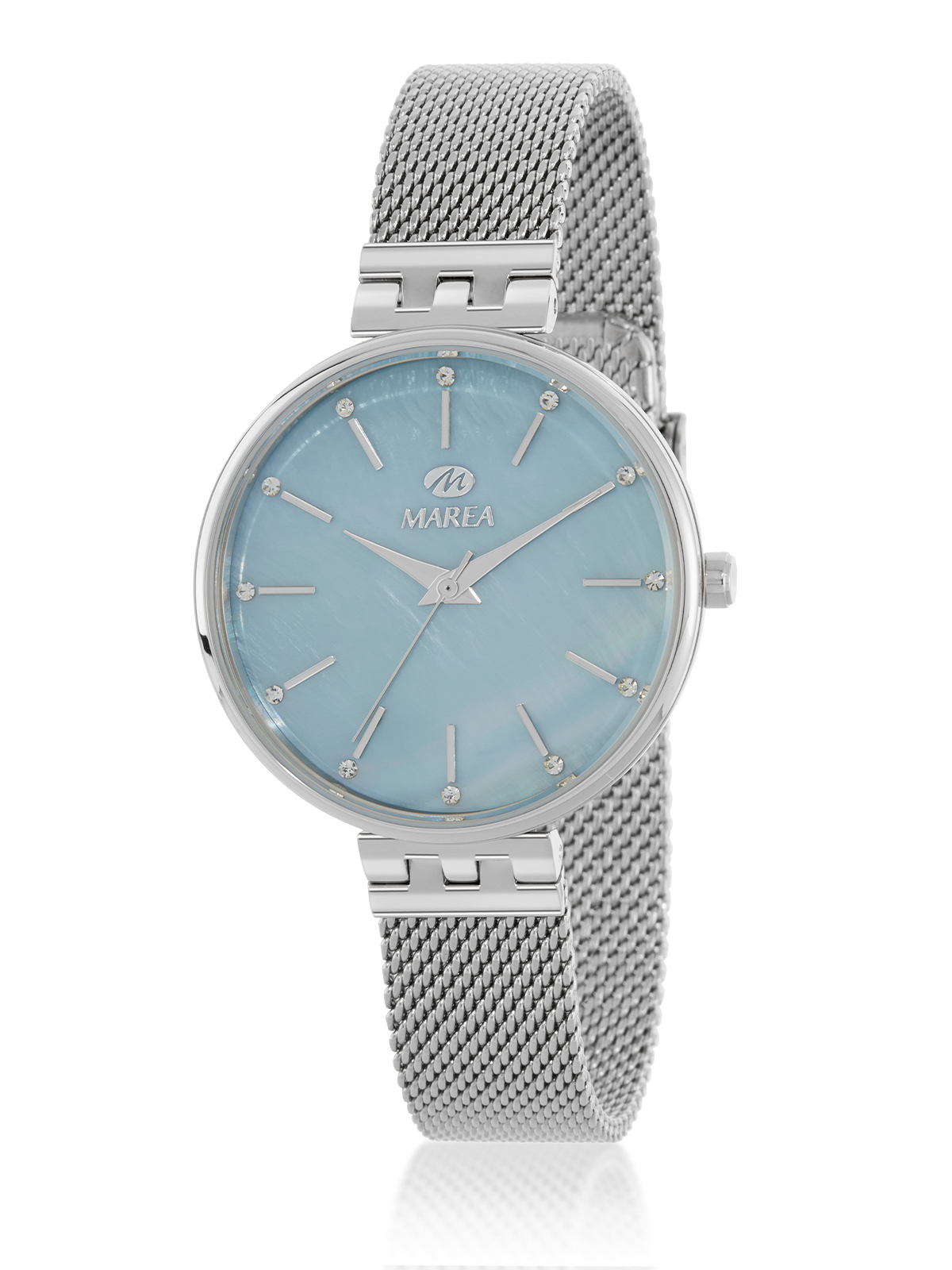 Movimiento japonés: 3 agujas. Diámetro Caja: 36 mm. Material Caja: Acero. Material Brazalete: Acero. Esfera: Color turquesa claro con detalles de pedrería. Resistente al agua: 5 ATM.