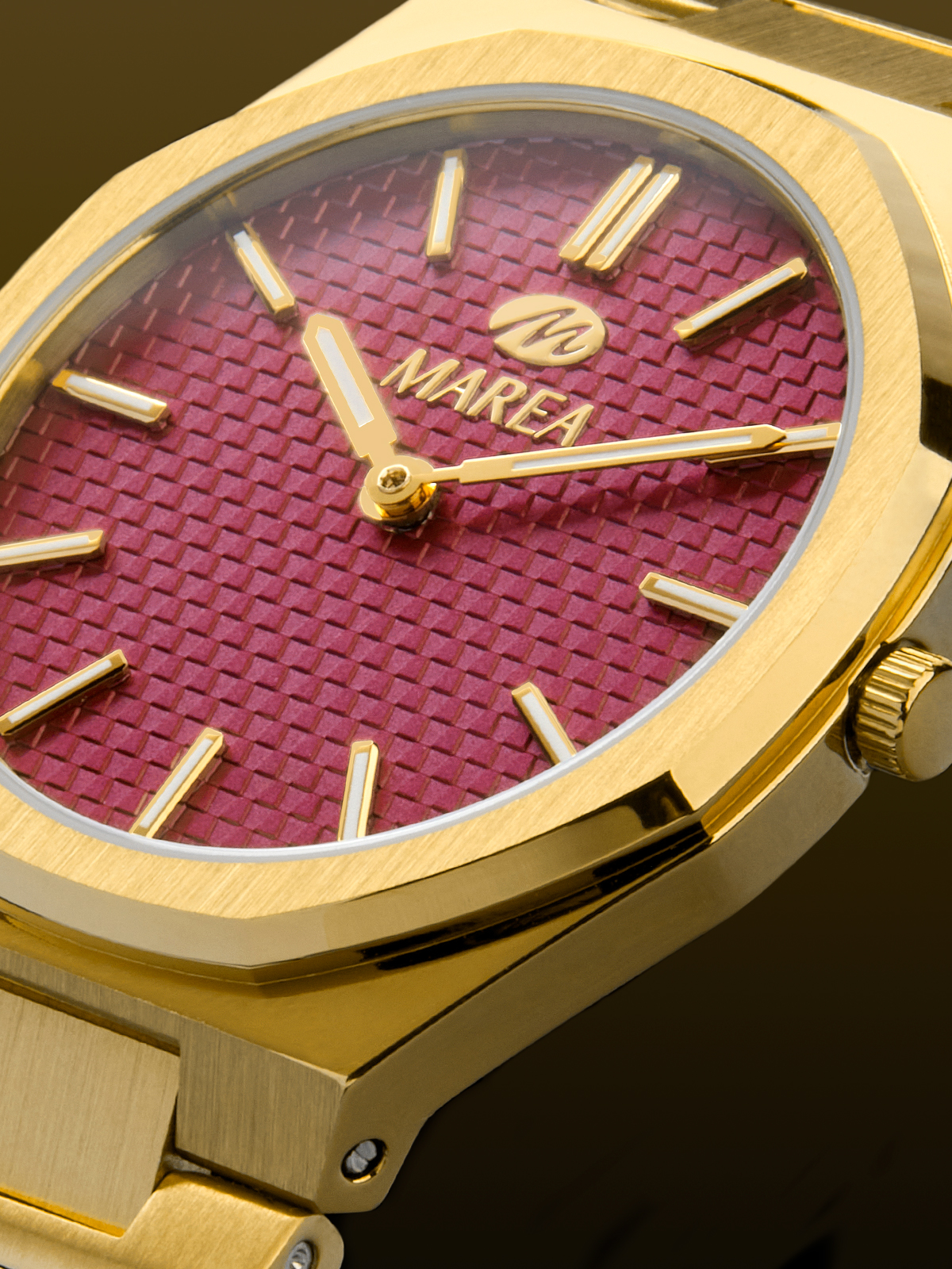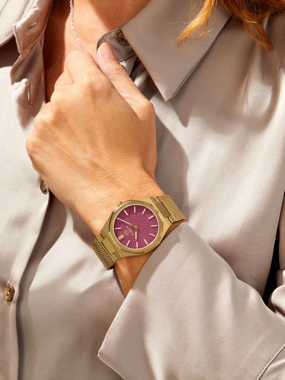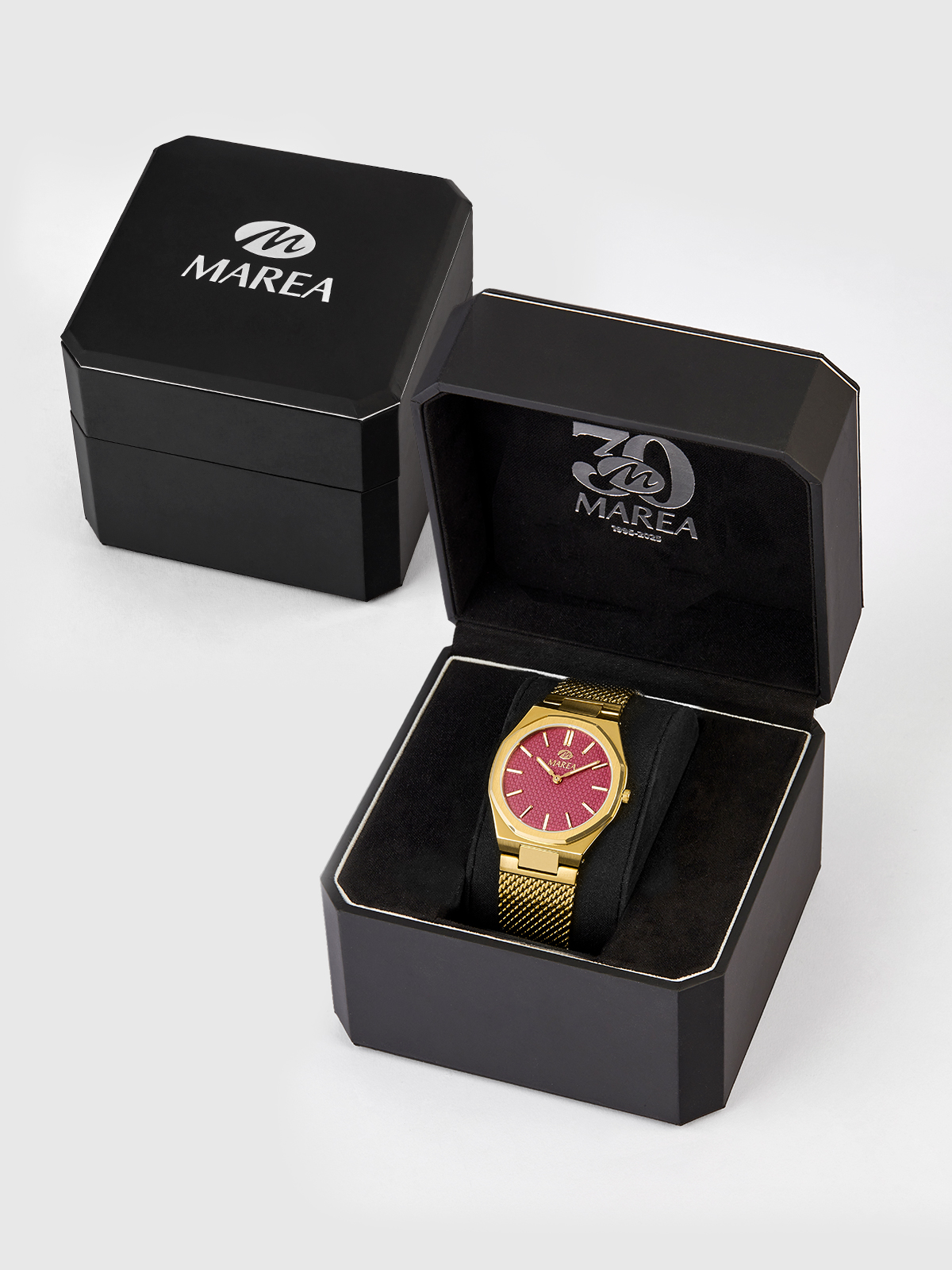 Diámetro Caja: 34 mm. Material Caja: Acero/Steel. Material Brazalete: Acero/Steel. Esfera: Color granate. Resistente al agua: 3 ATM.